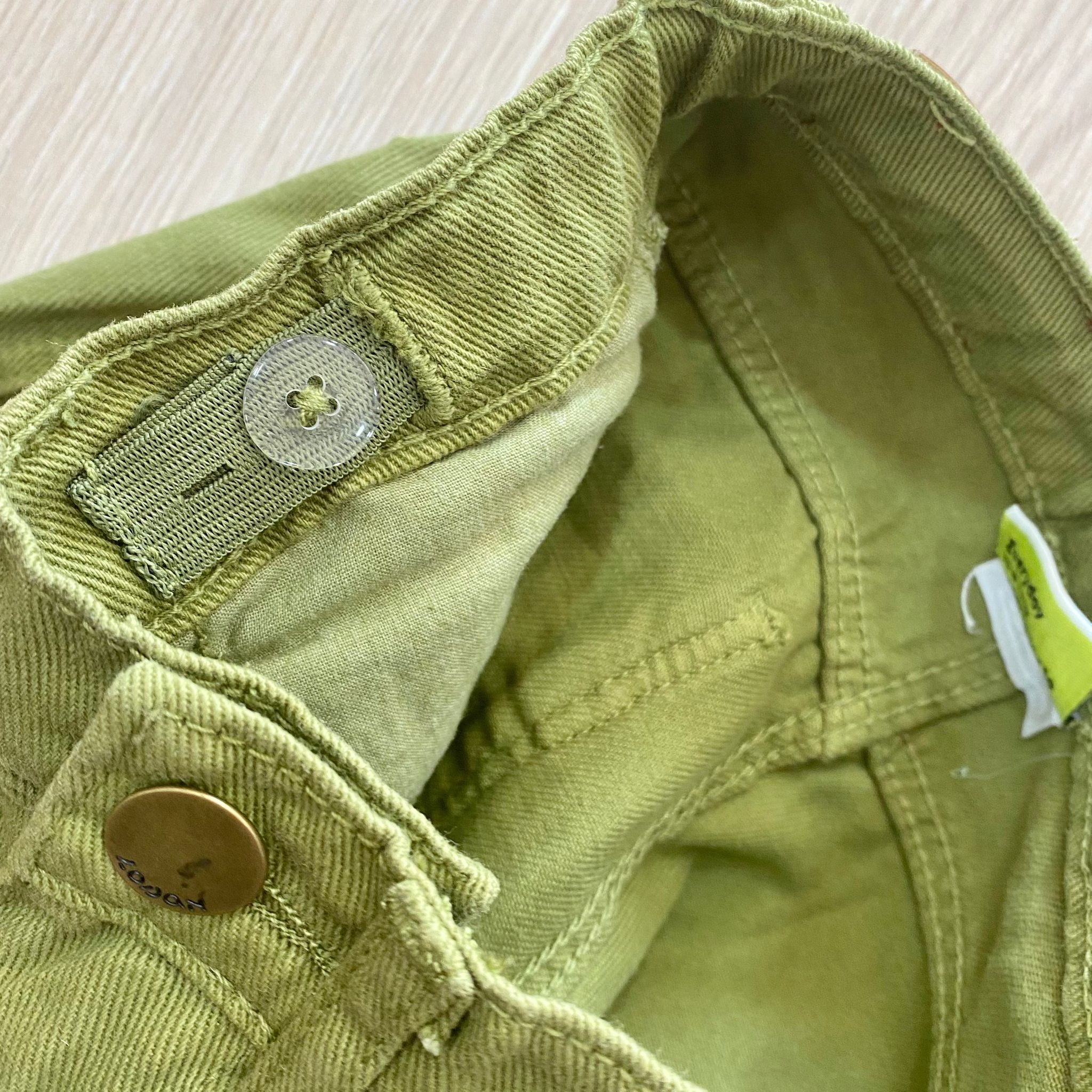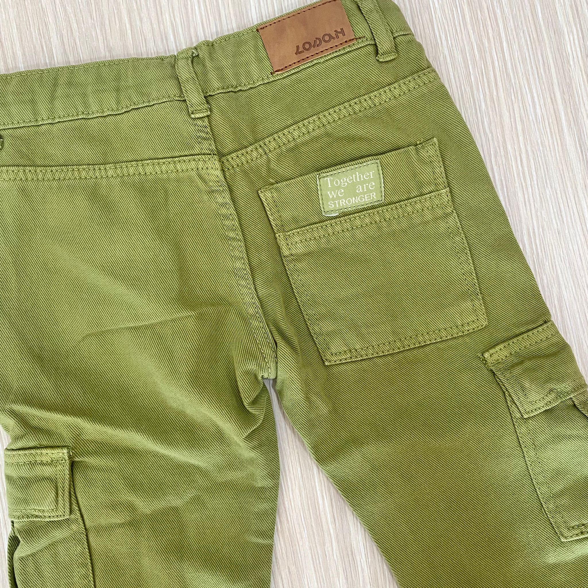 Cargo bambino in denim, di colore verde, con dettaglio di tasconi laterali. Cargo con elastico regolabile all’interno.