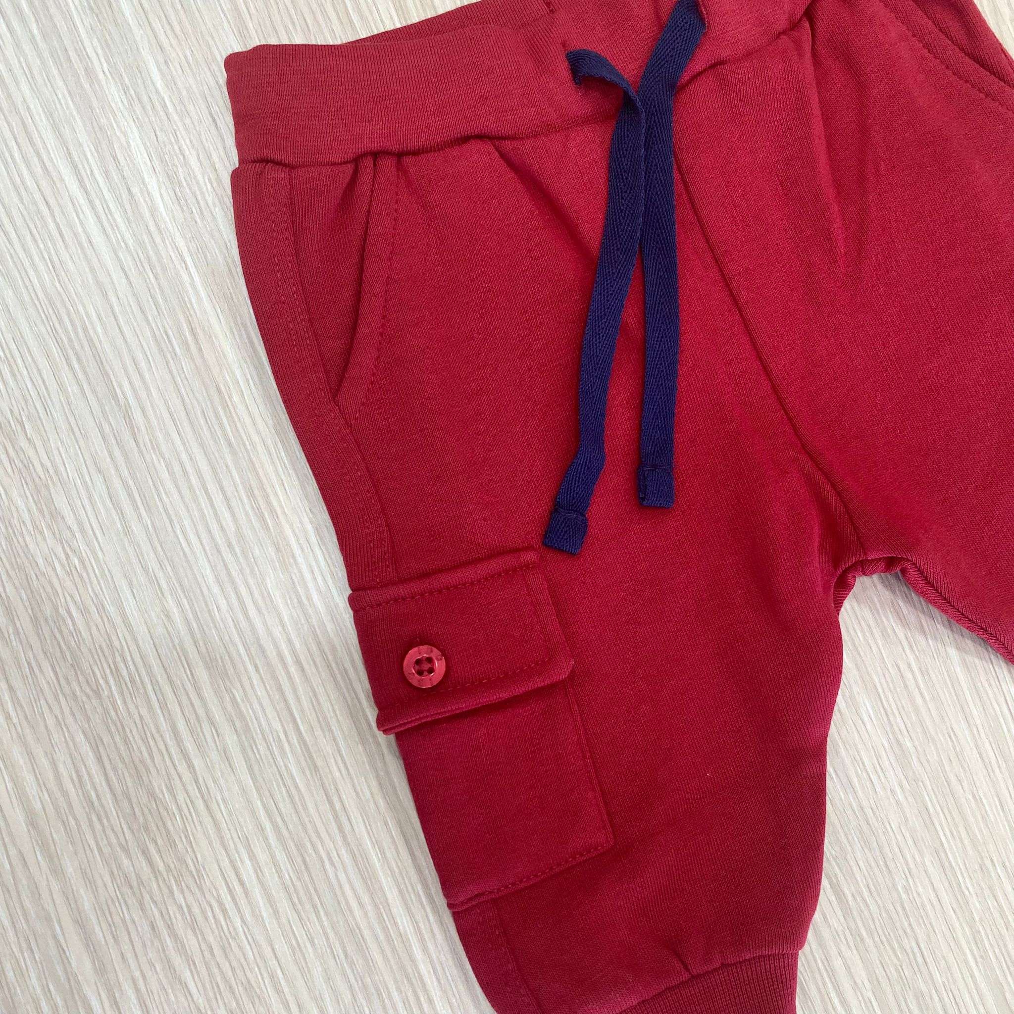 Cargo neonato/bambino in cotone felpato, di colore rosso, con dettaglio di tasche e laccetto regolabile.