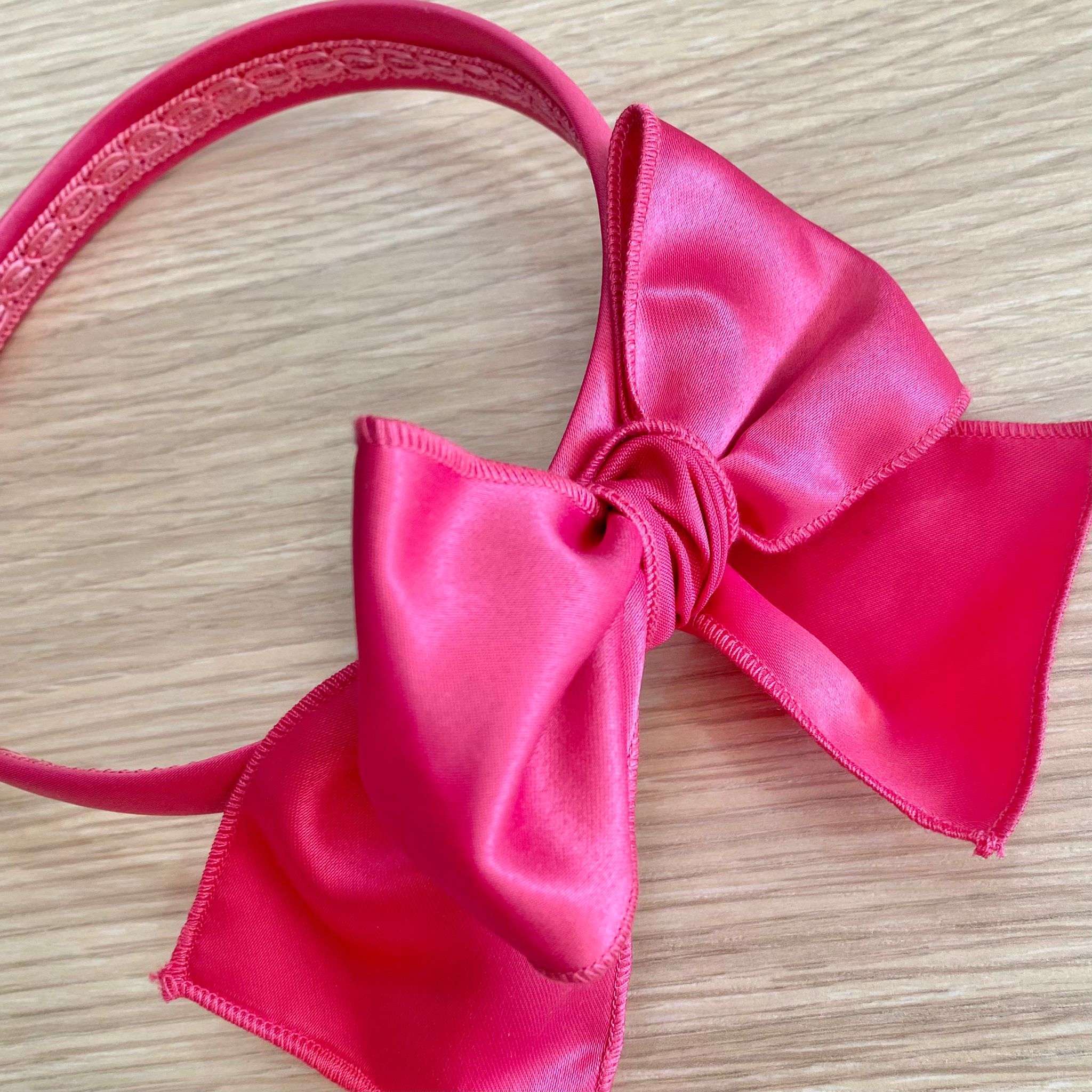 Cerchietto bambina in cotone rasato, di colore fucsia, con applicazione di fiocco.