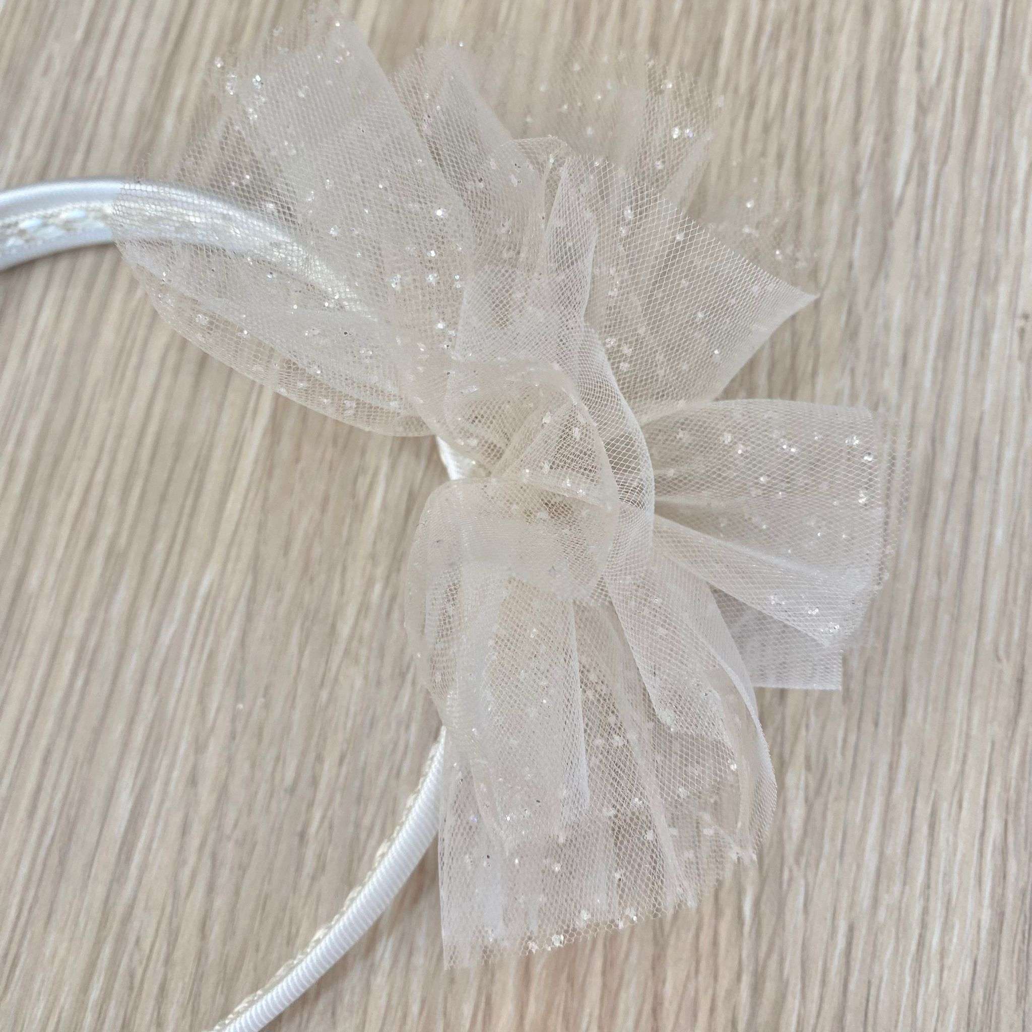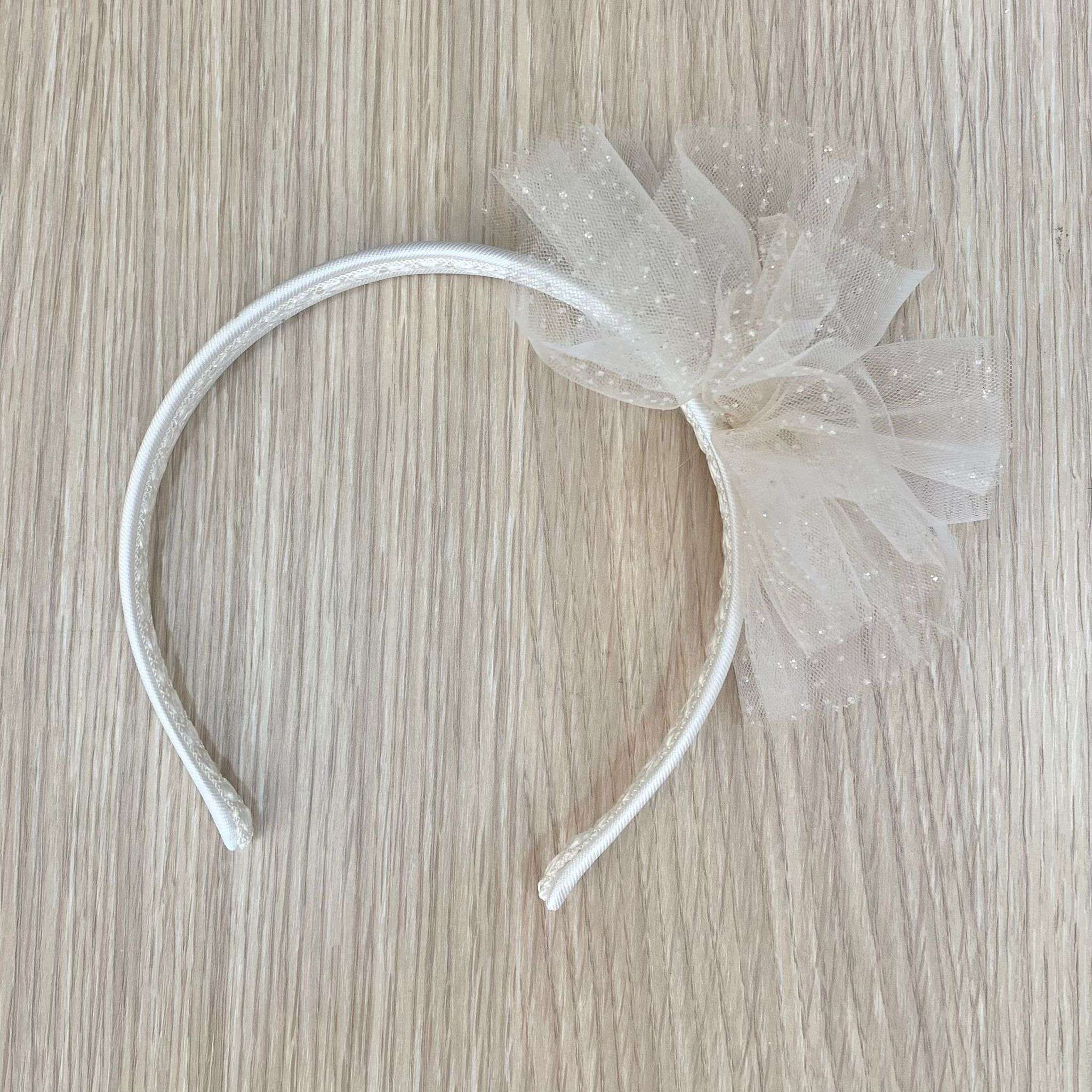 Cerchietto bambina in cotone rasato, di colore avorio, con applicazione di tulle brillantinato.