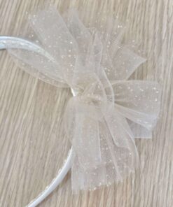 Cerchietto bambina in cotone rasato, di colore avorio, con applicazione di tulle brillantinato.