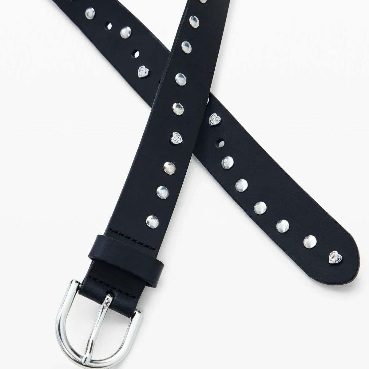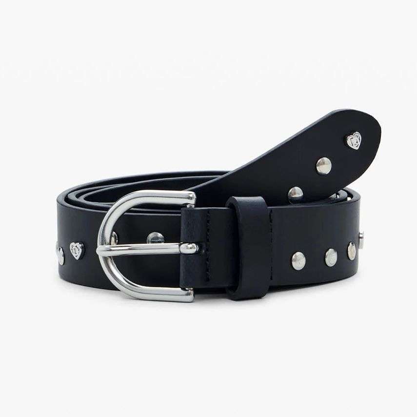 Cintura effetto pelle con borchie e chiusura a fibbia.