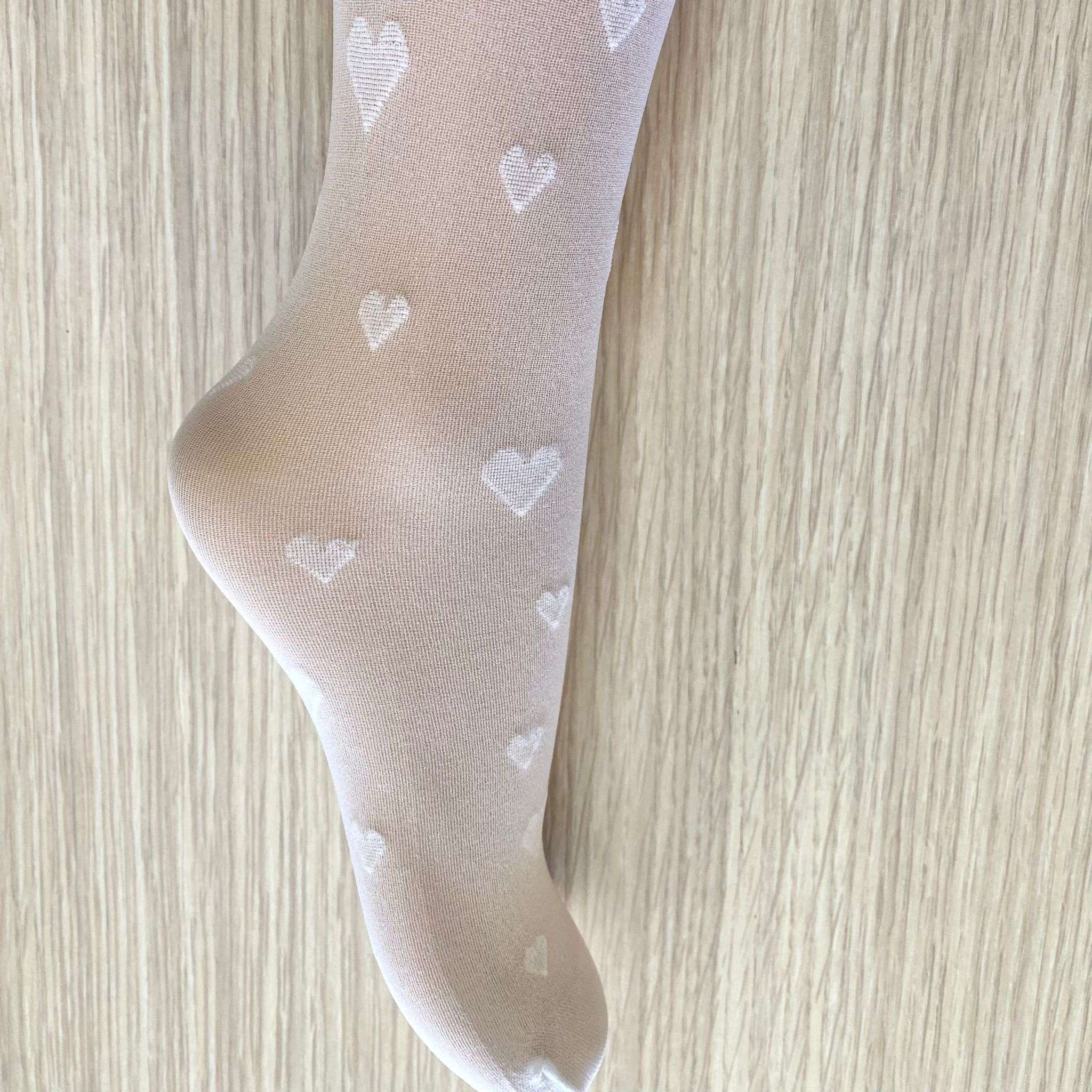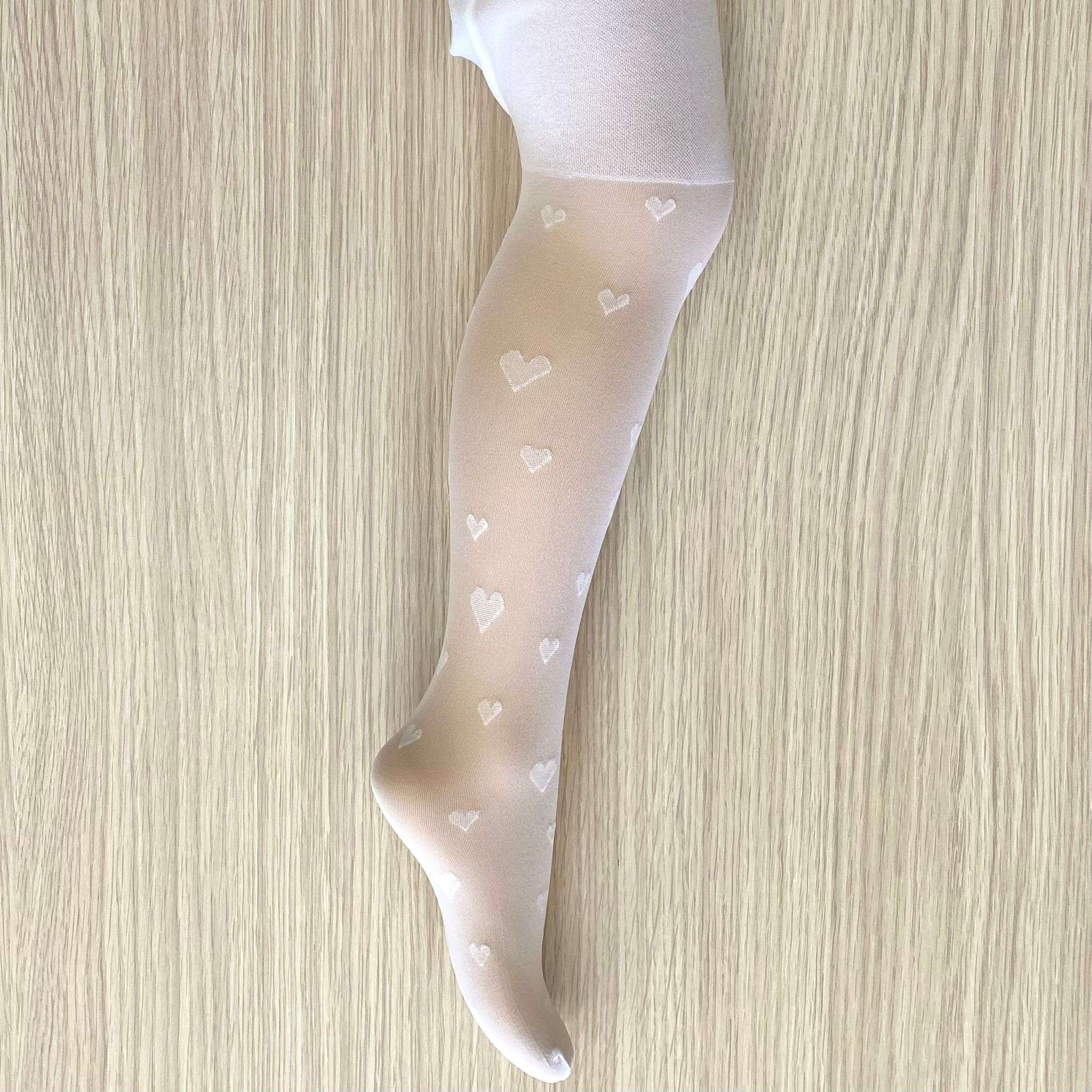 Collant neonata/bambina, in microfibra elasticizzato, di colore bianco, con cuoricini in rilievo.