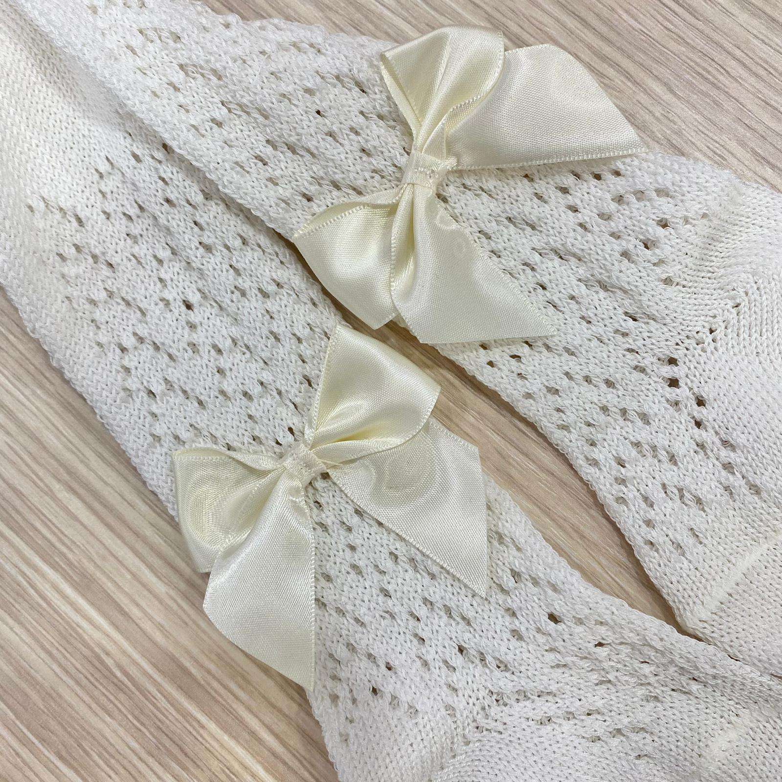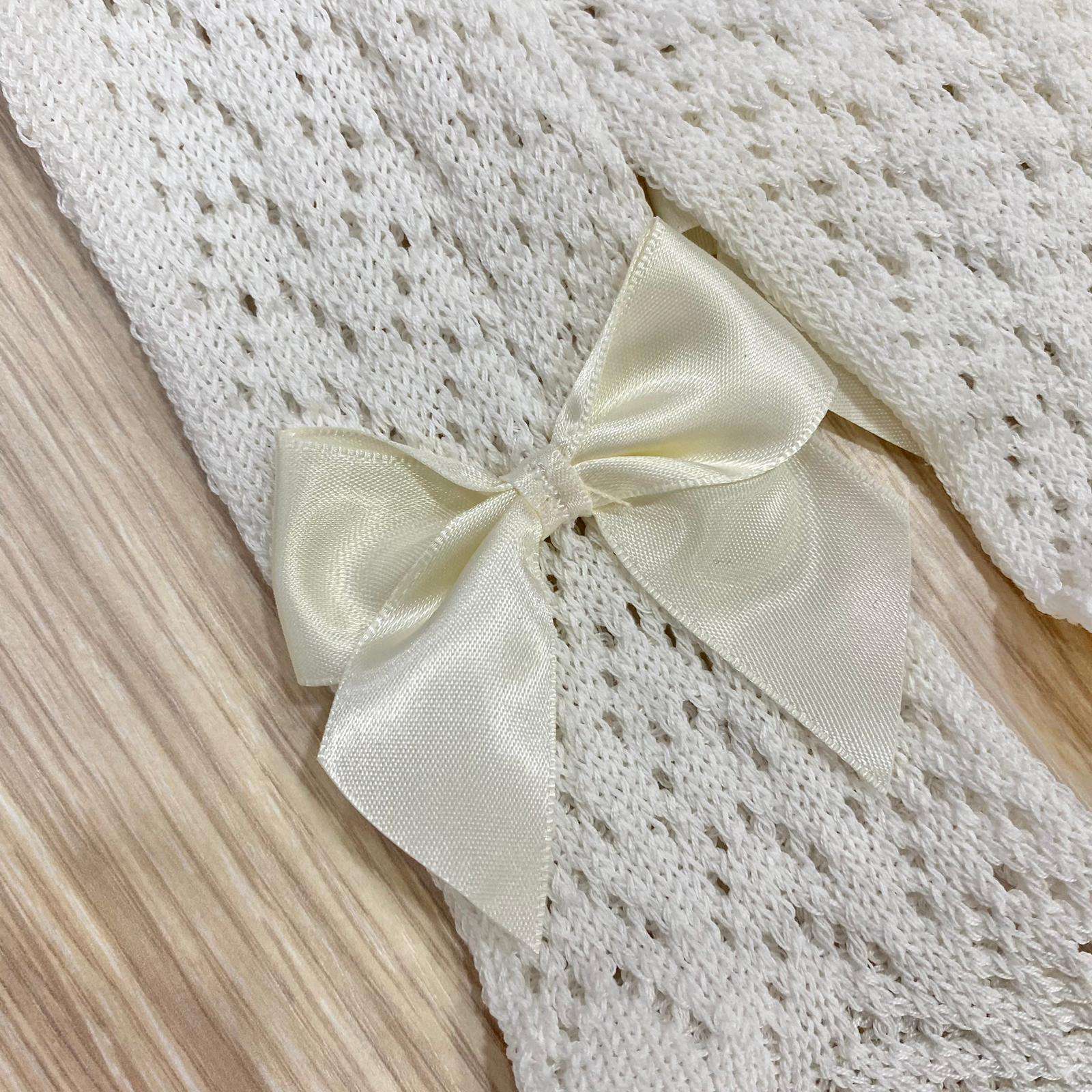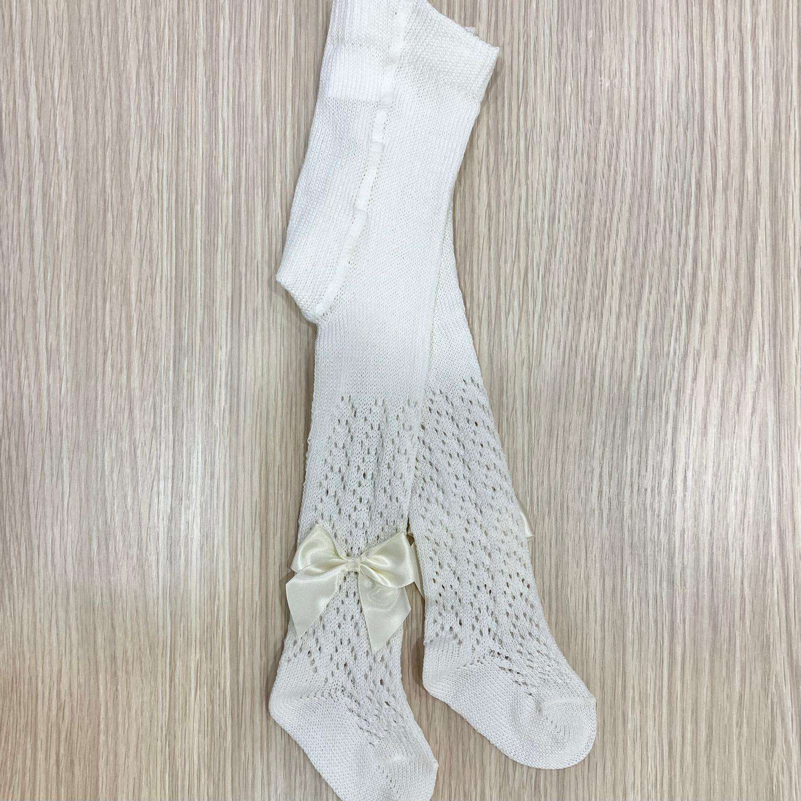 Collant neonata/bambina in cotone elasticizzato, di colore panna, con applicazione di fiocchetto laterale.