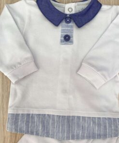 Completino due pezzi neonato in cotone, di colore bianco e blu con applicazione di bottoncini.