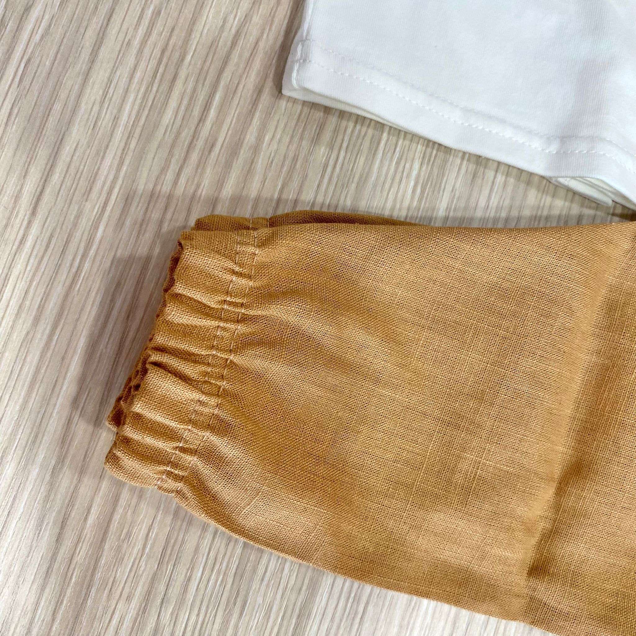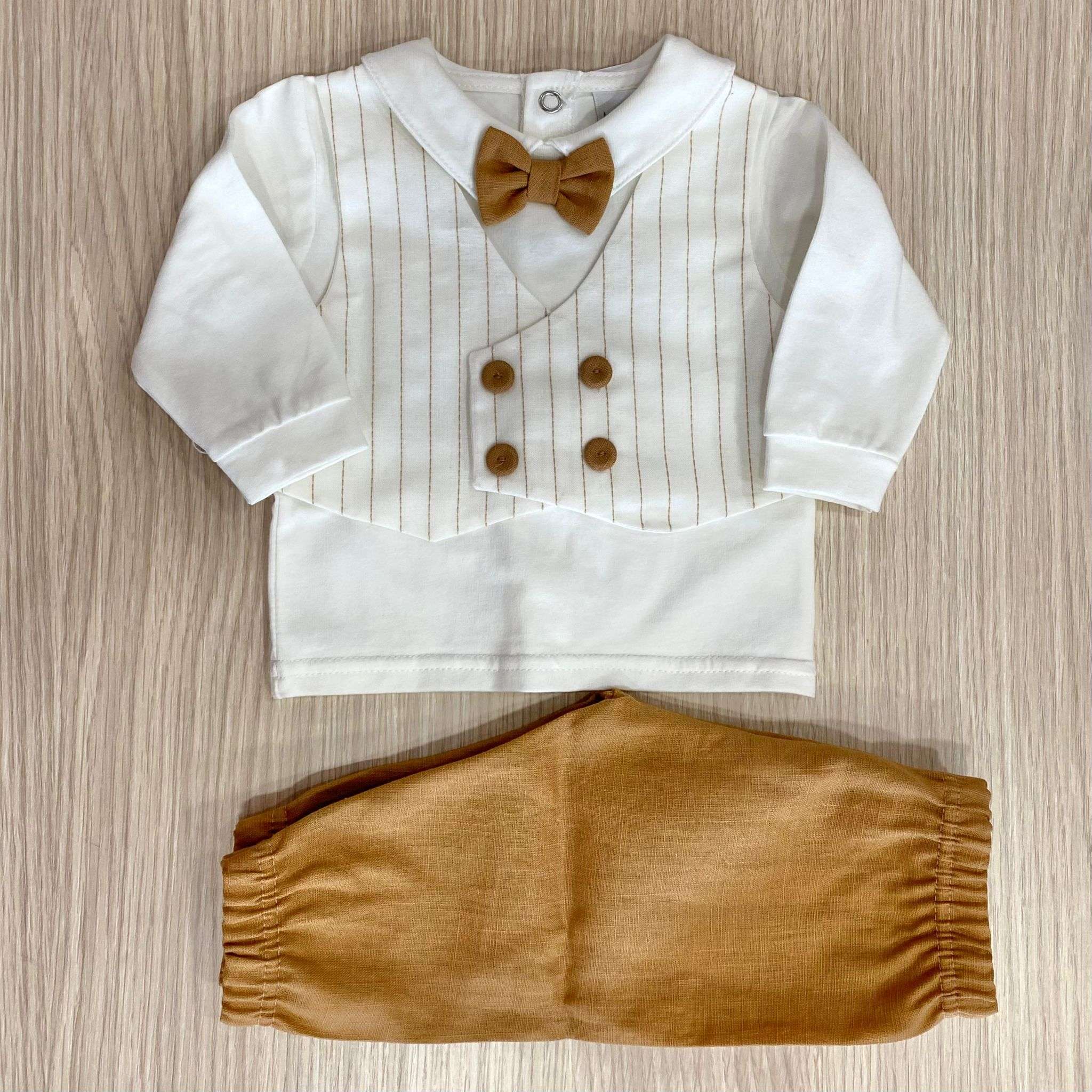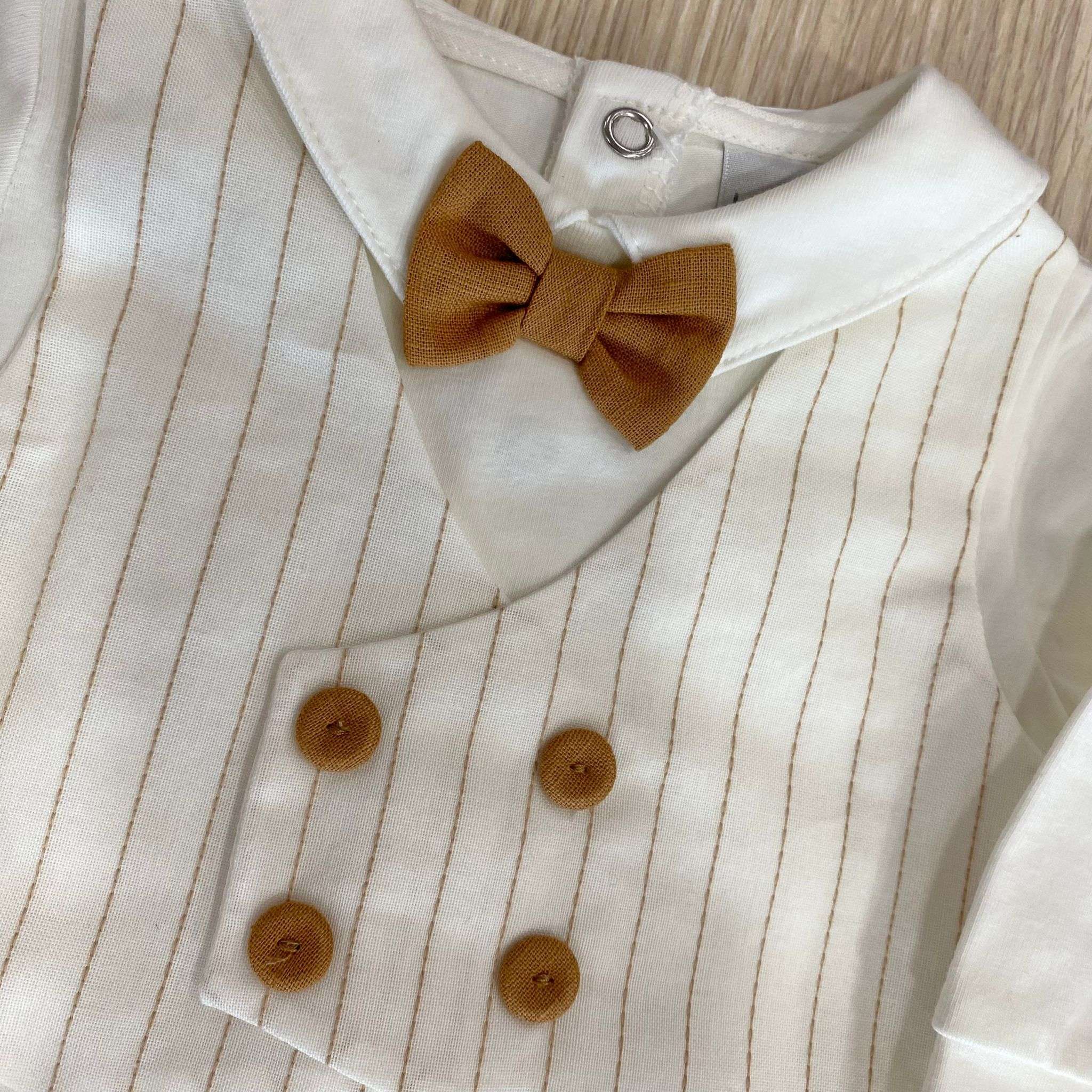 Completino due pezzi neonato in cotone misto lino, di colore panna e cammello, con dettaglio di finto gilet e finto papillon.