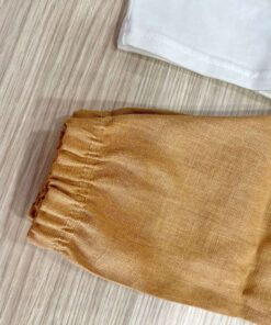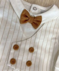 Completino due pezzi neonato in cotone misto lino, di colore panna e cammello, con dettaglio di finto gilet e finto papillon.