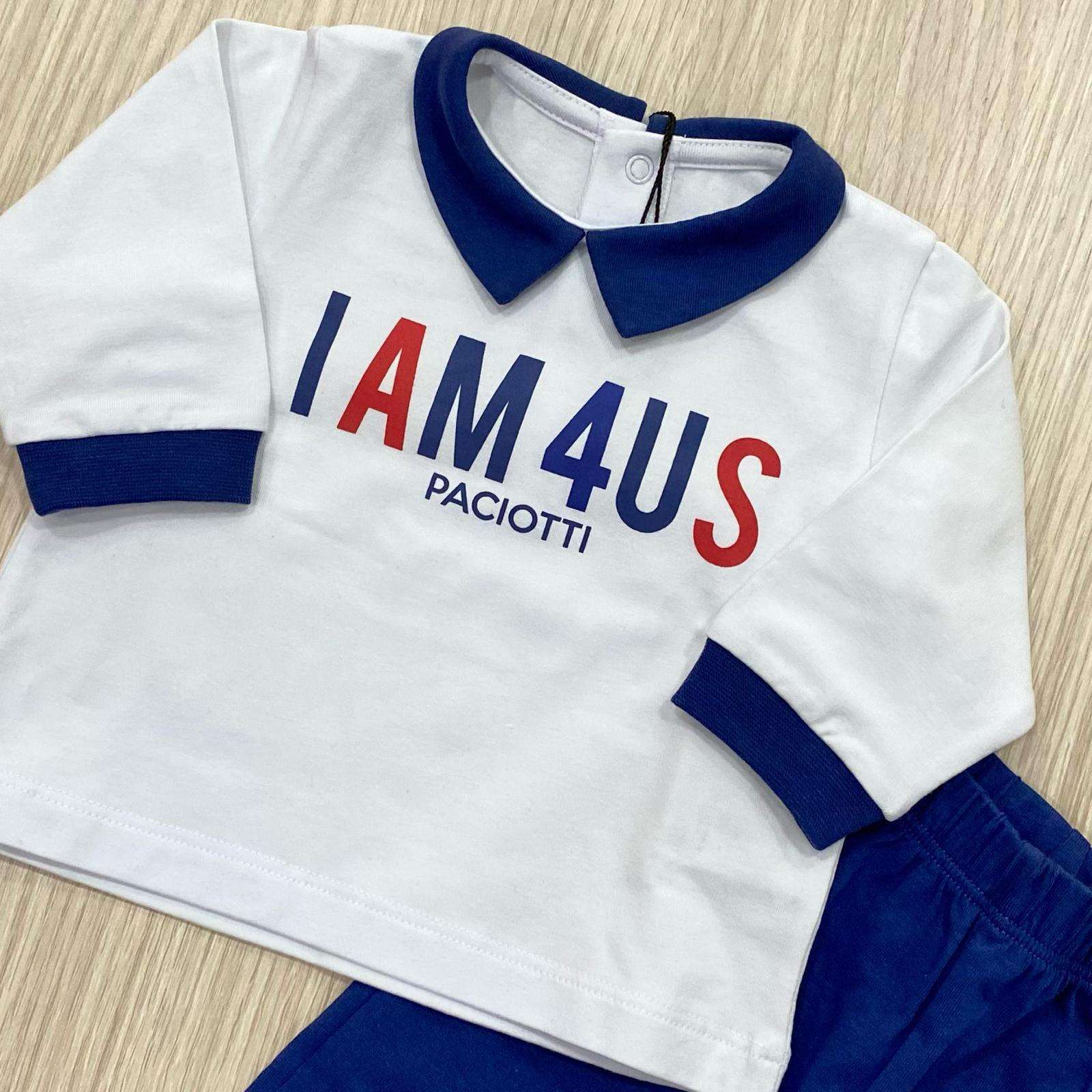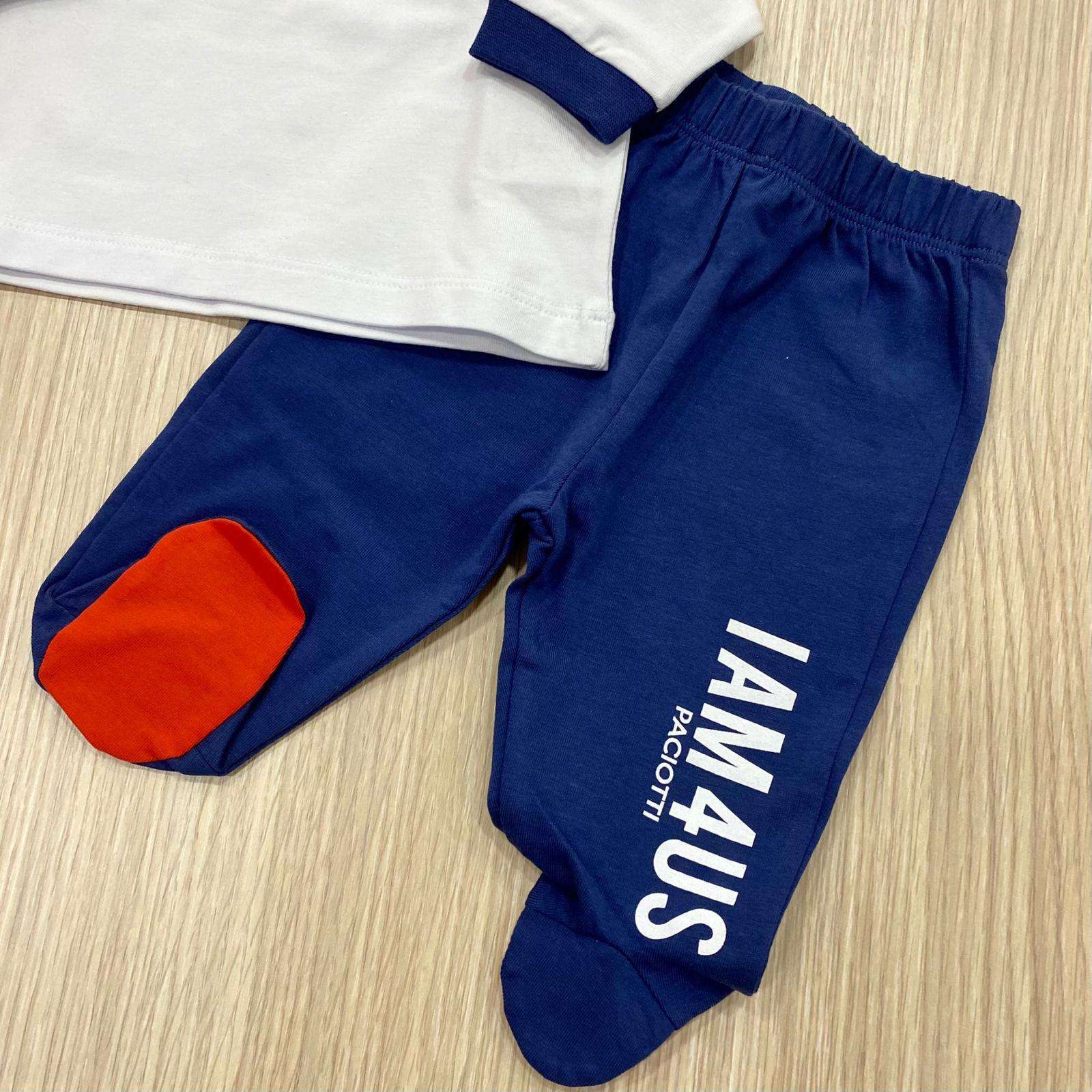 Completo due pezzi neonato in cotone, di colore bianco e blu con dettagli in rosso.