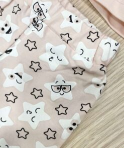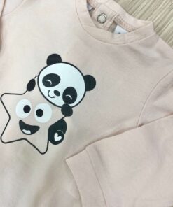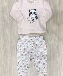 Completino due pezzi neonata in cotone, di colore rosa, con stampa di colore panna e nero.