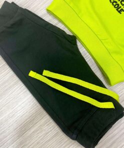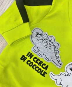 Completino due pezzi neonato/bambino in cotone, di colore verde e nero, con disegnoe scritta ricamata. Completo con polsini.