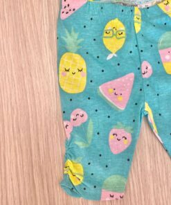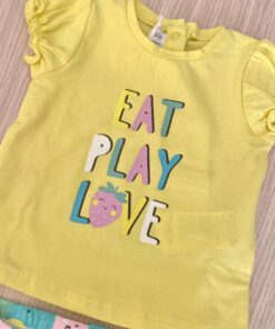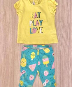 Completino due pezzi neonata/bambina in cotone, di colore giallo e verde marino, con stampa glitterata e disegni di vari colori.