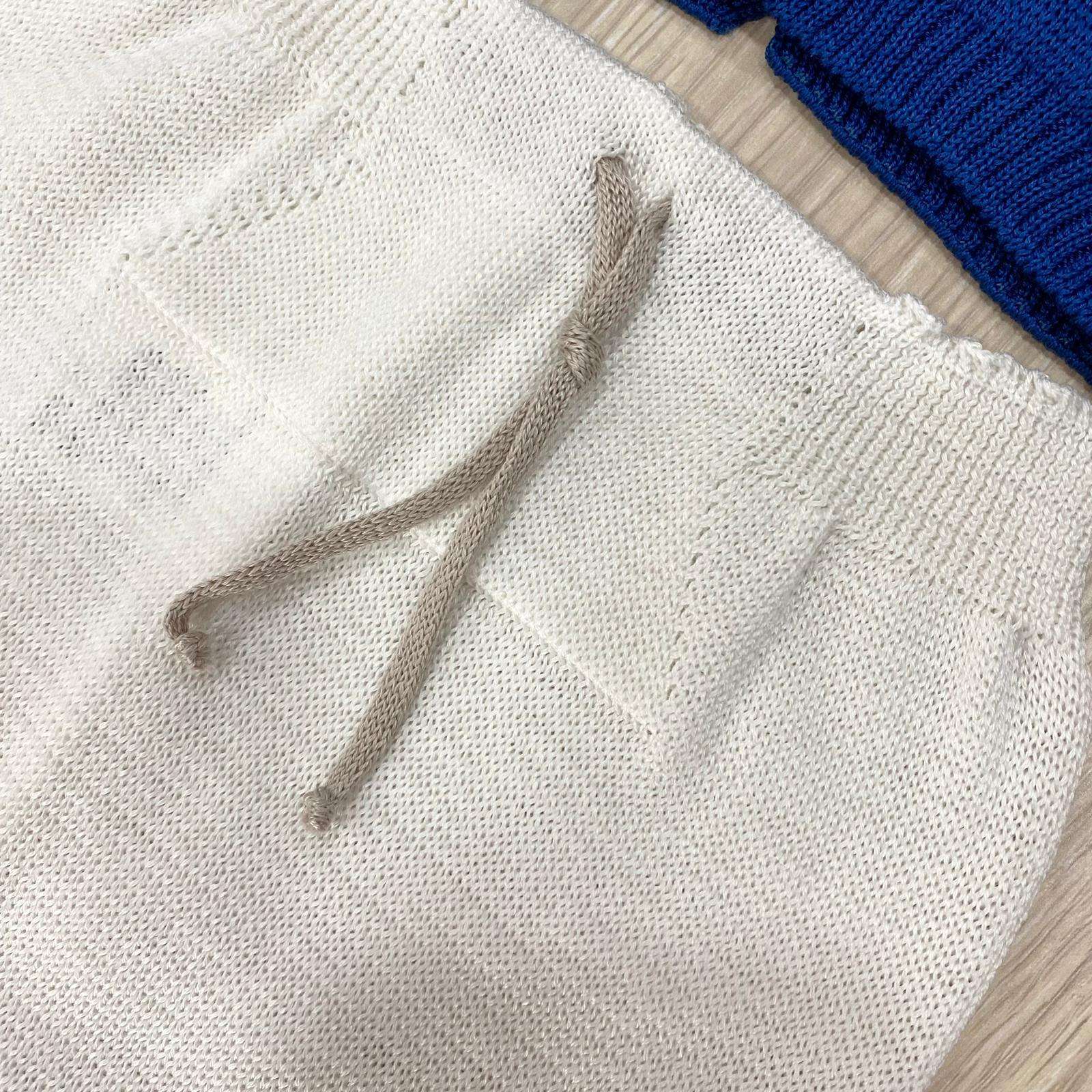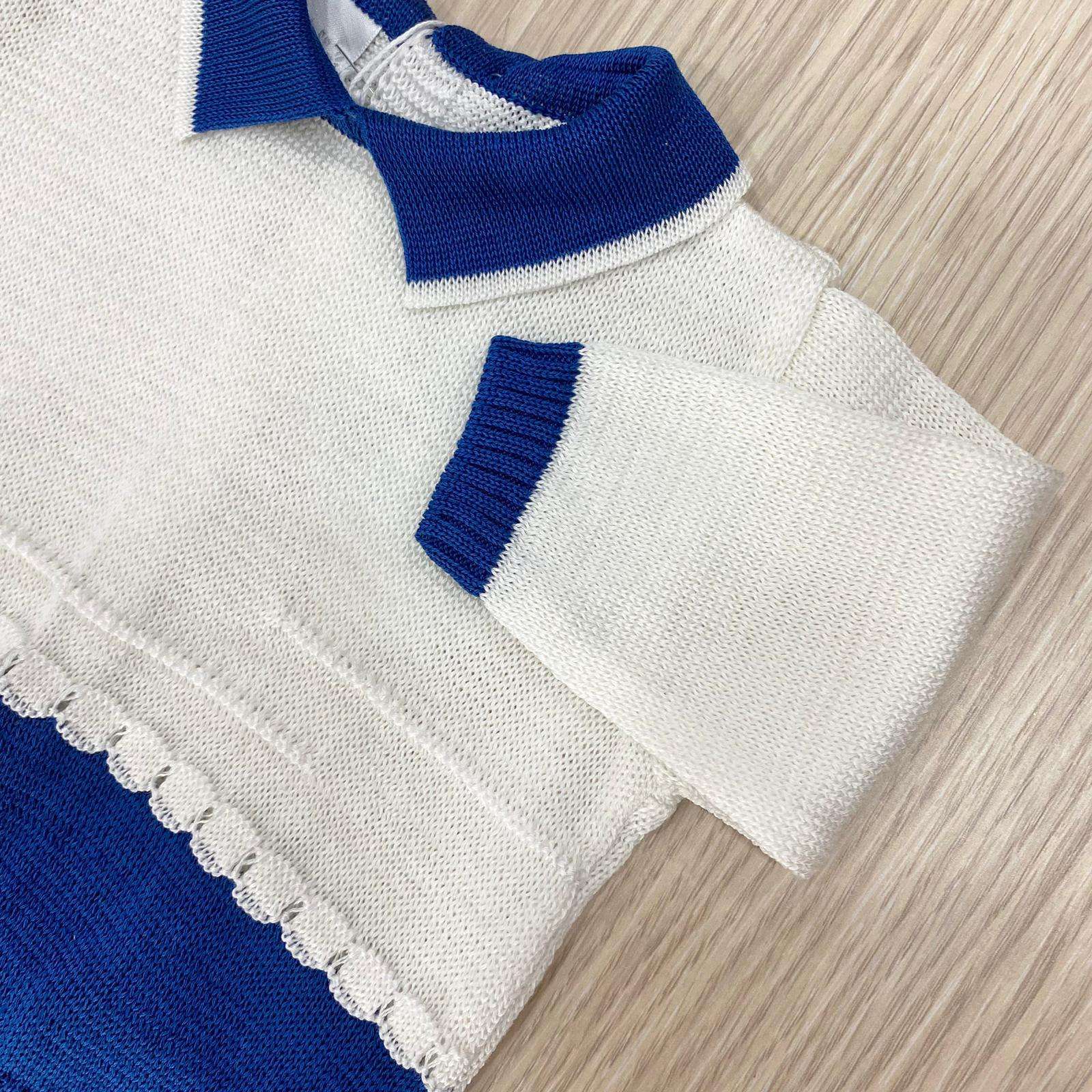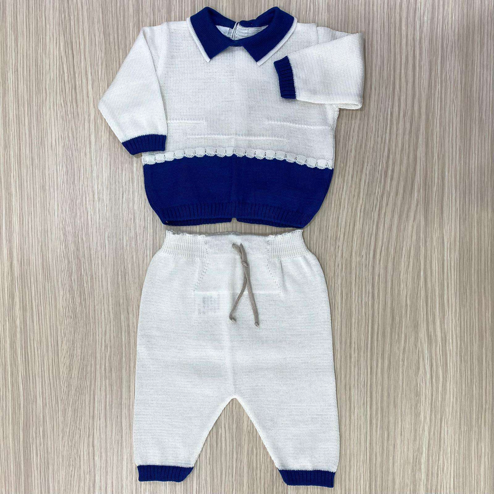 Completino due pezzi neonato in filo, di colore panna e blu.