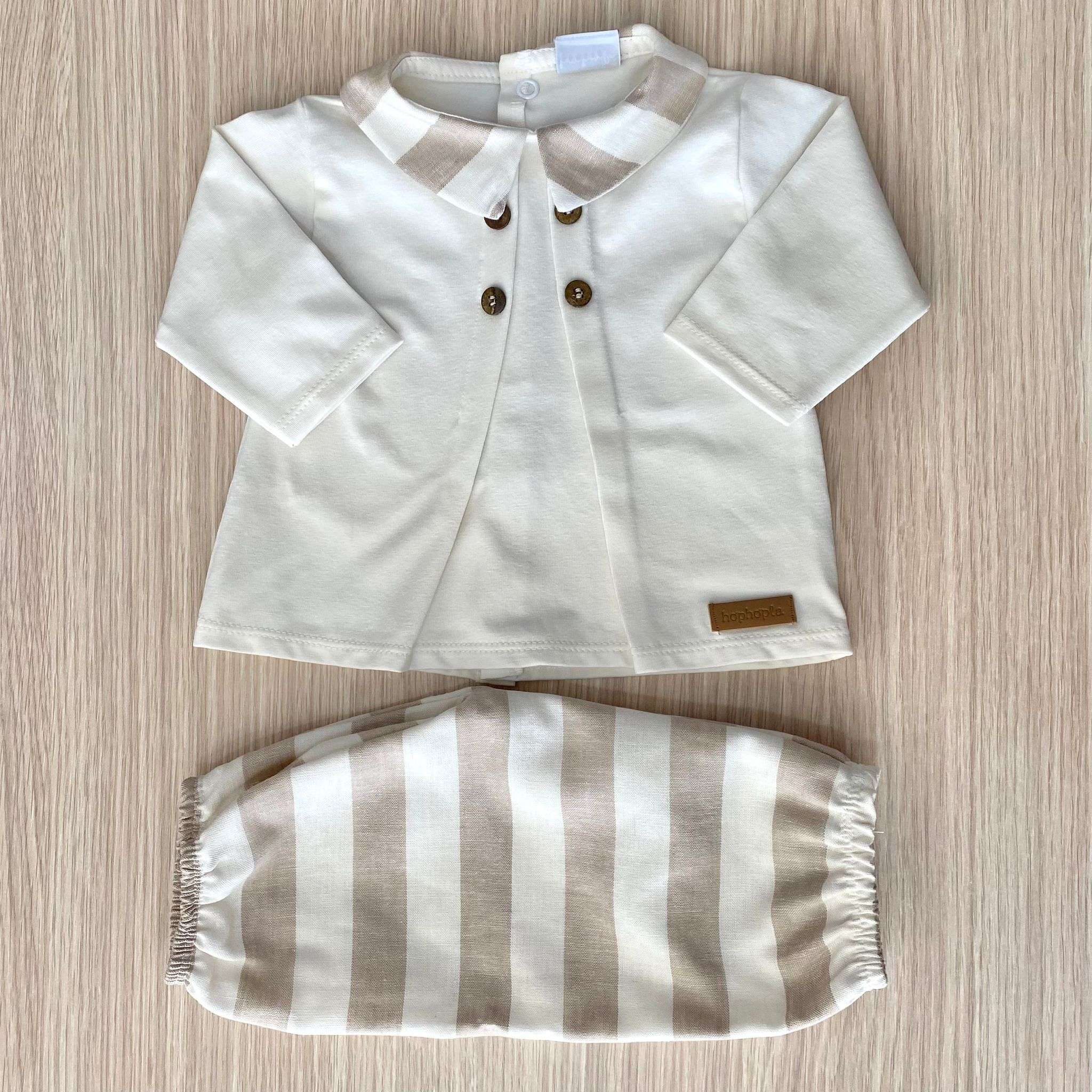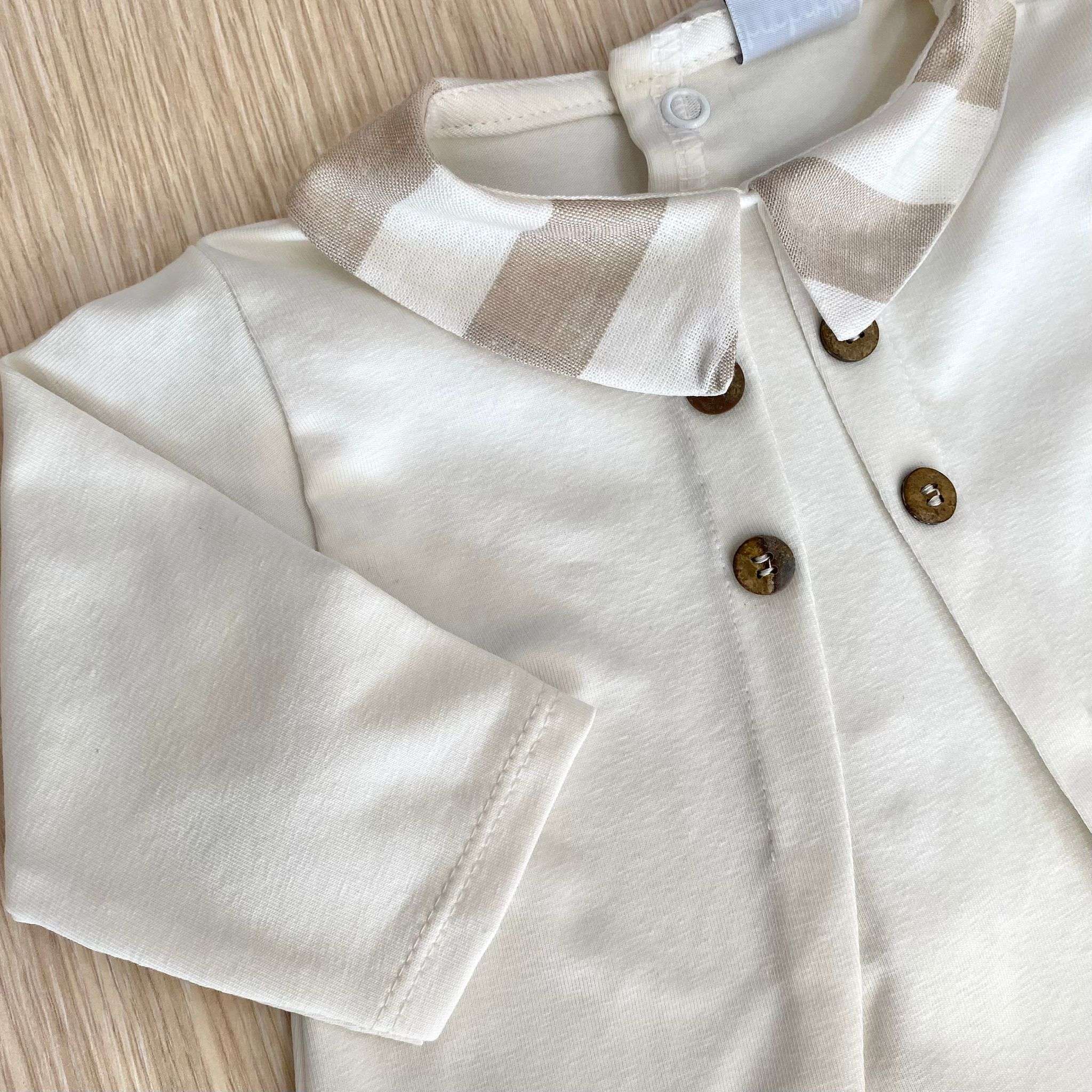 Completino due pezzi neonato in cotone, di colore panna e beige, con applicazione di bottoncini.