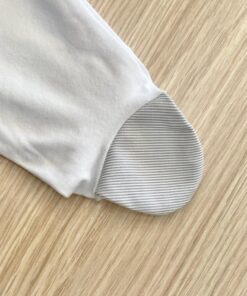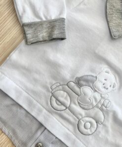 Completino due pezzi neonato in cotone, di colore bianco e grigio. con dettaglio di finta camicia, e con applicazione di bottoncino.