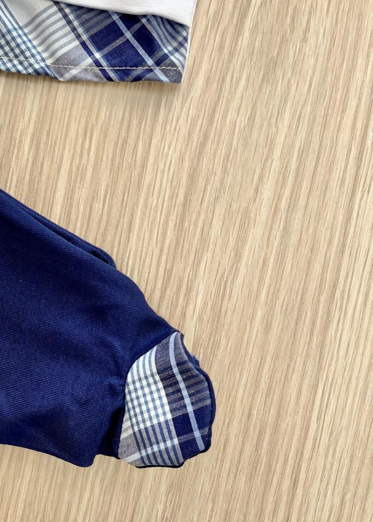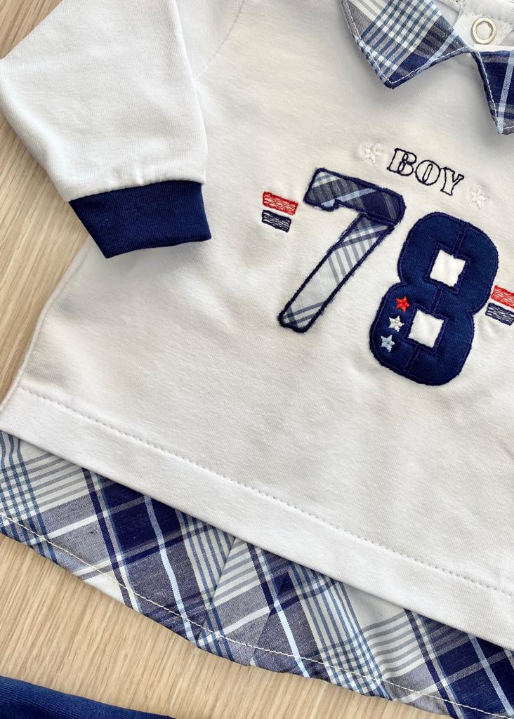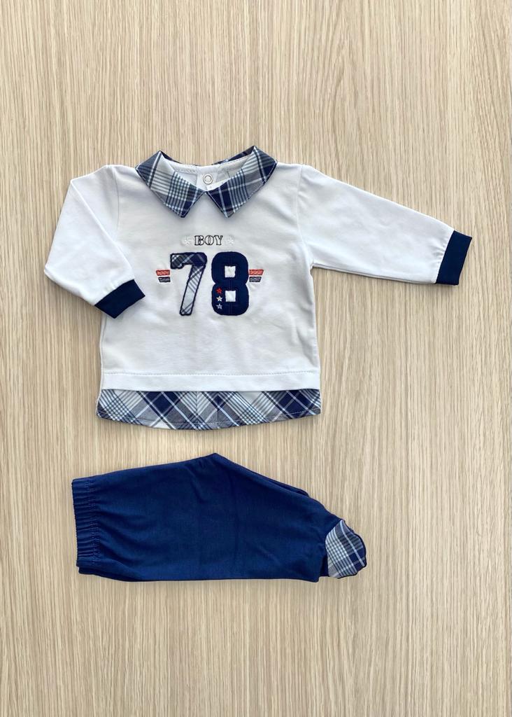 Completino due pezzi neonato in cotone anallergico, di colore bianco e blu con applicazione in rilievo.