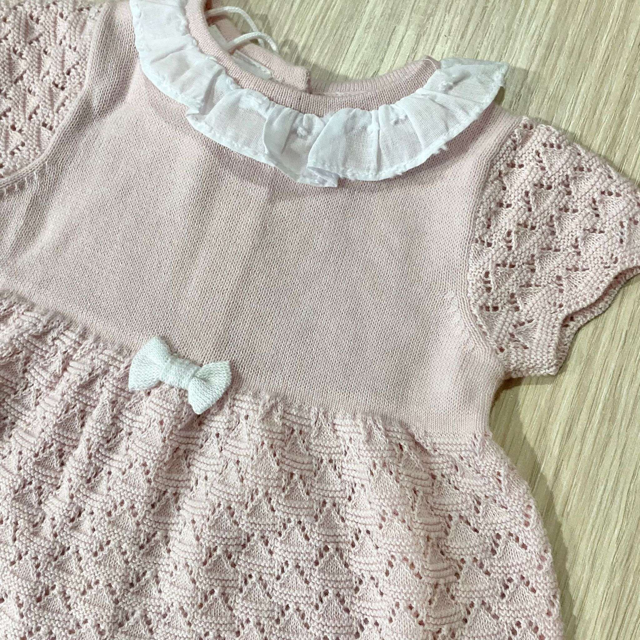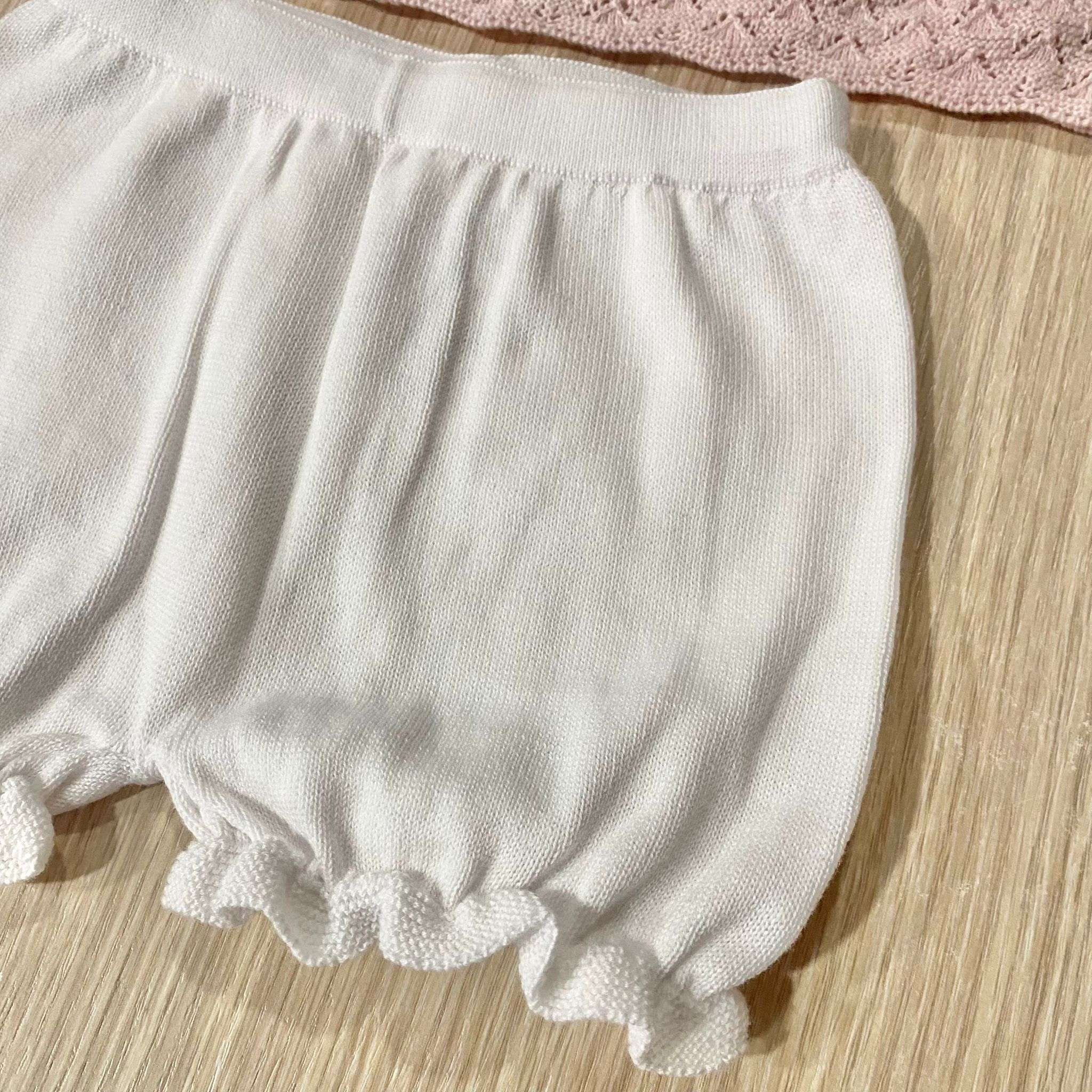 Completino due pezzi neonata in filo, di colore rosa e bianco, con mutandina copripannolino/pantaloncino.