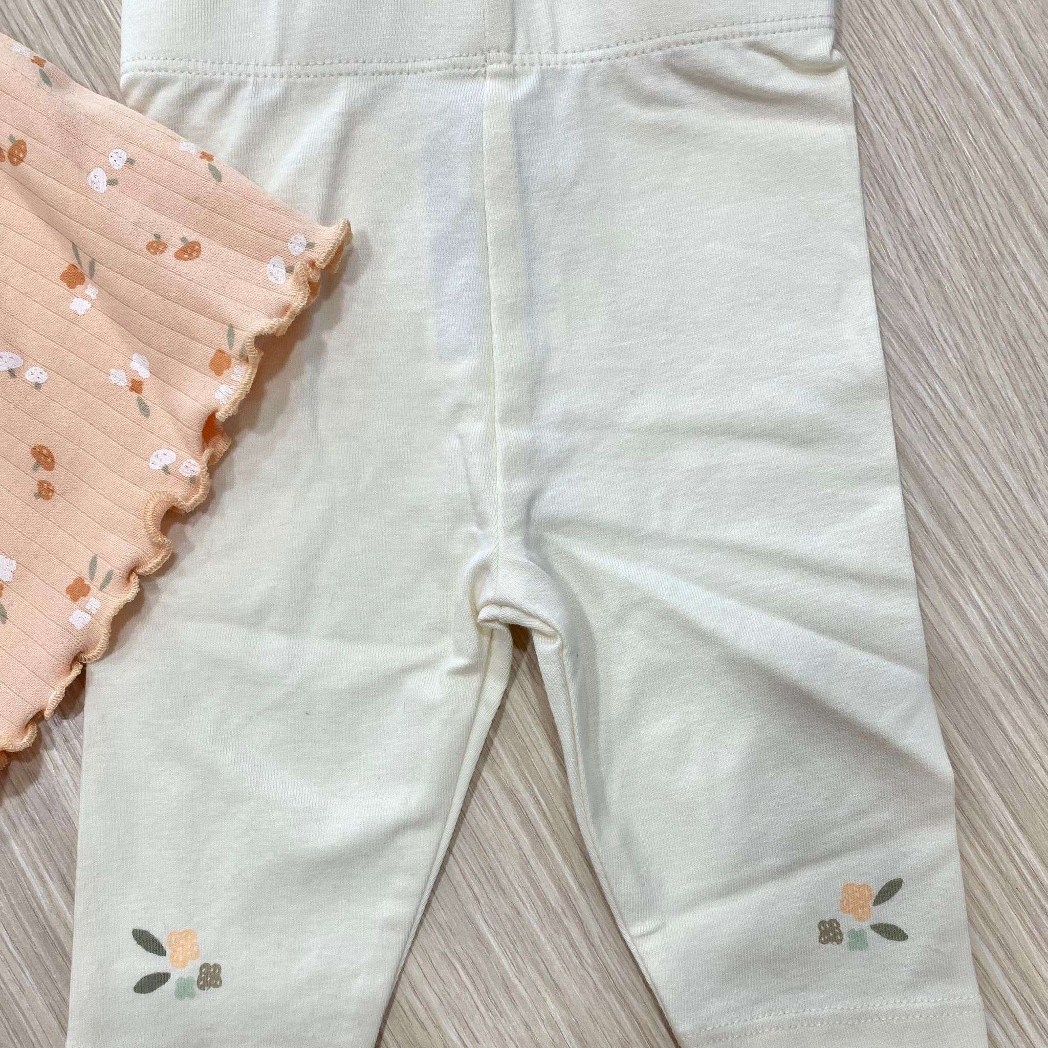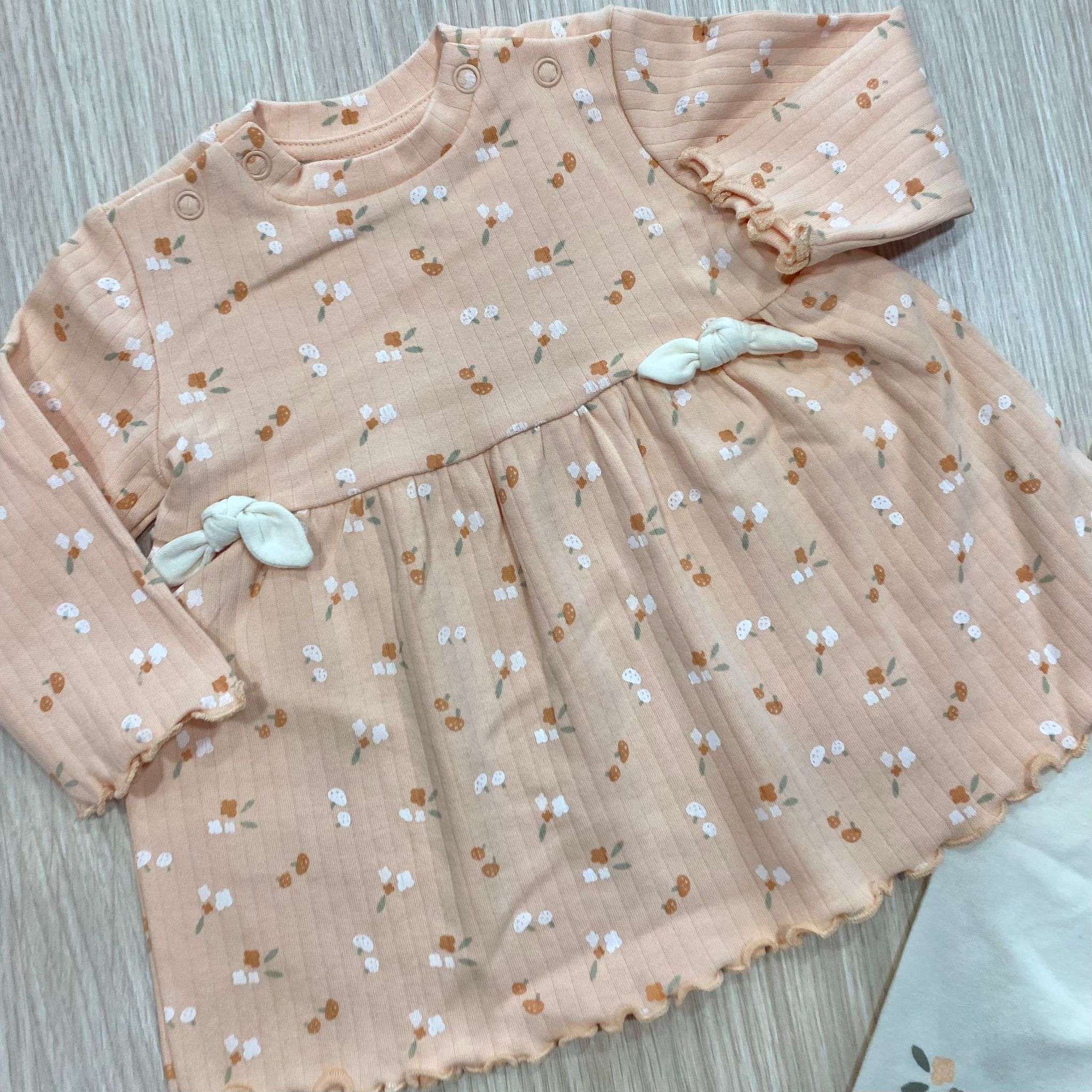 Completino due pezz neonata in caldo cotone, di colore salmone ed ecrù, con disegni di vari colori.