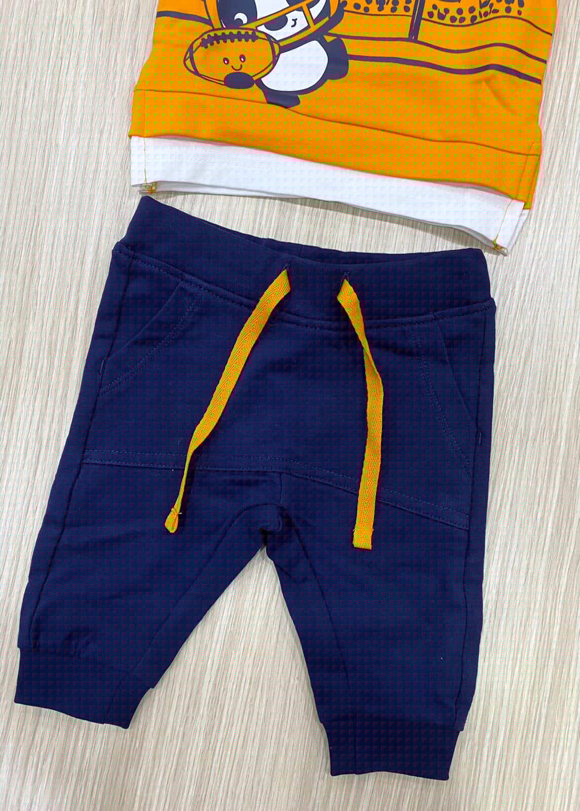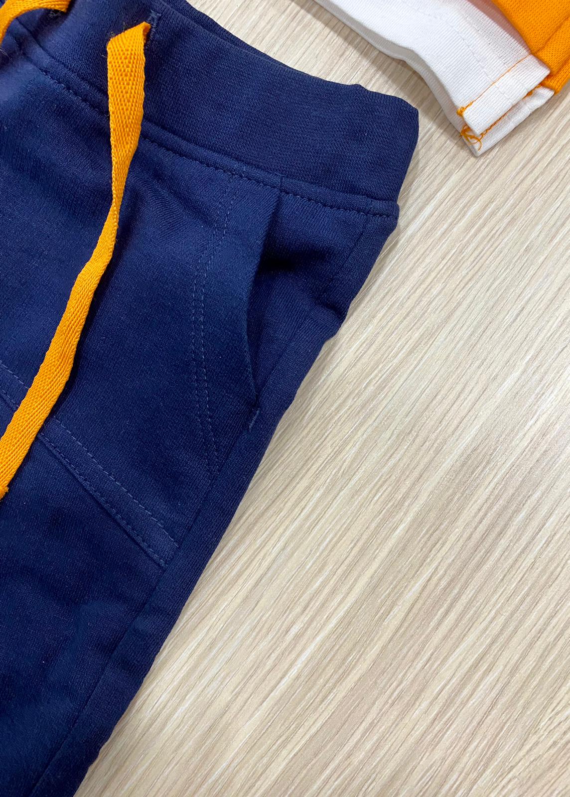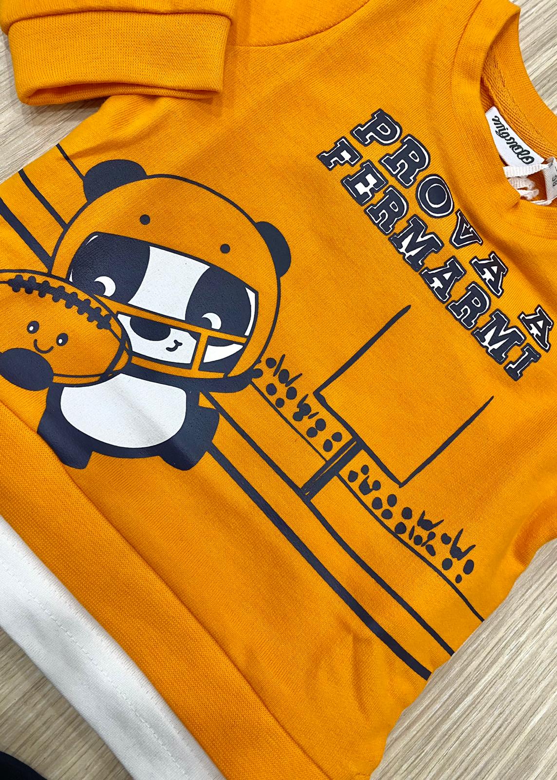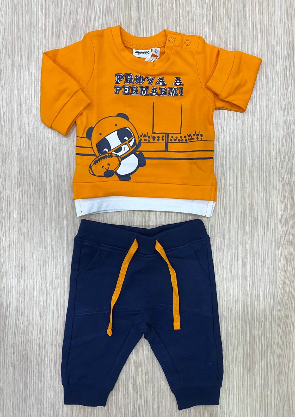 Completino neonato/bambino in cotone garzato, di colore arancione e blu con stampa di colore blu e bianco.