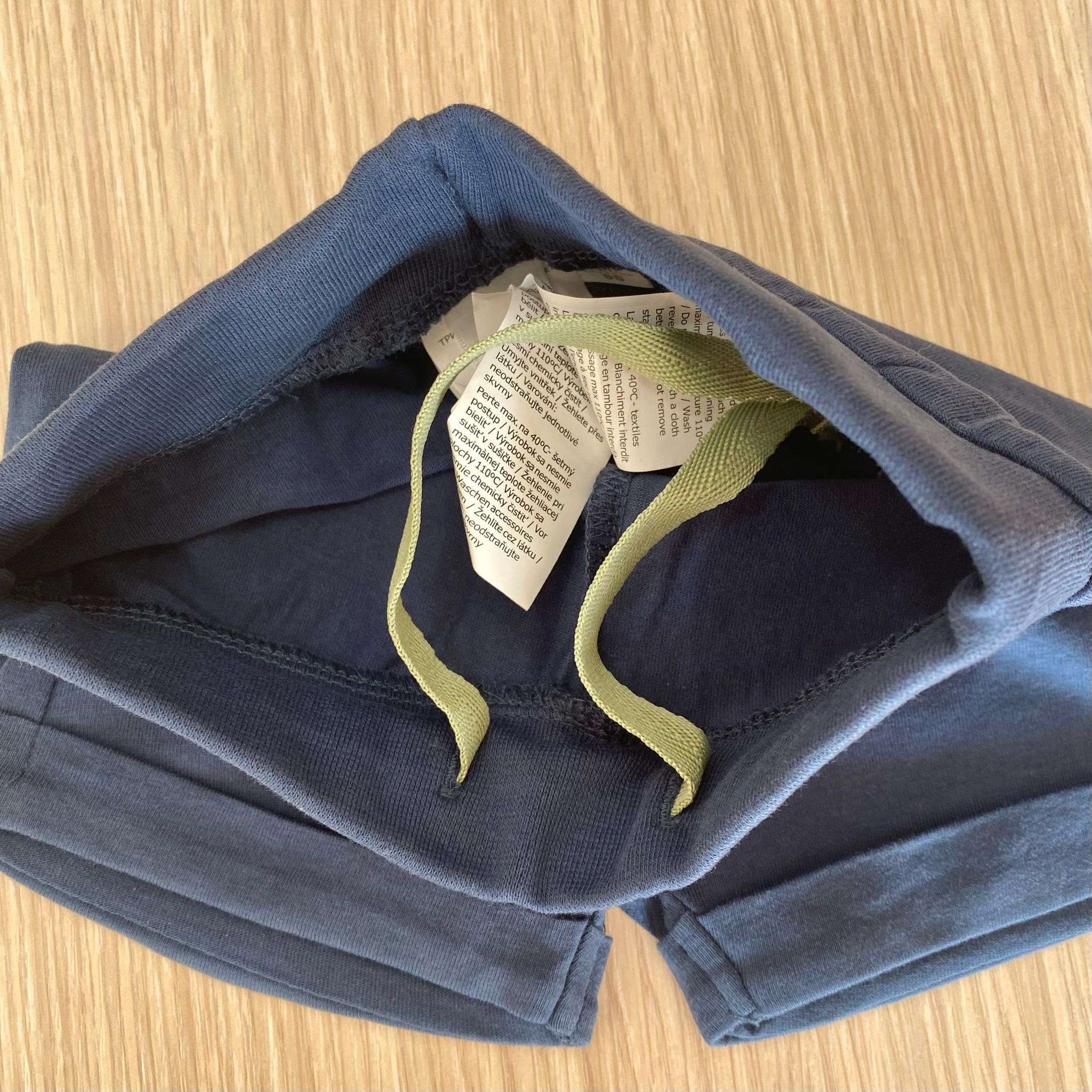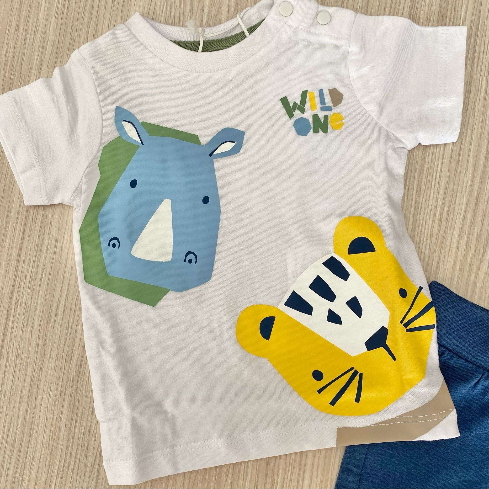 Completino due pezzi neonato/bambino in cotone, di colore bianco e blu, con scritte e disegni di vari colori. Pantaloncino con laccetto regolabile.
