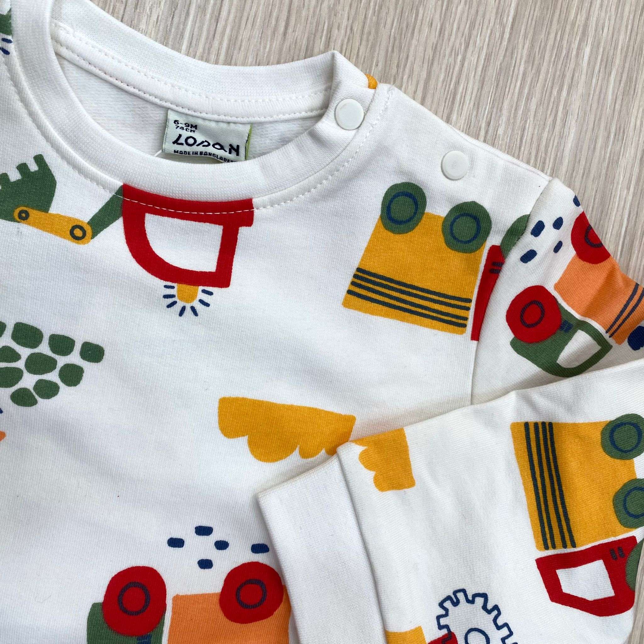 Completino due pezzi neonato/bambino in cotone felpato, di colore panna e giallo scuro, con disegni di vari colori.