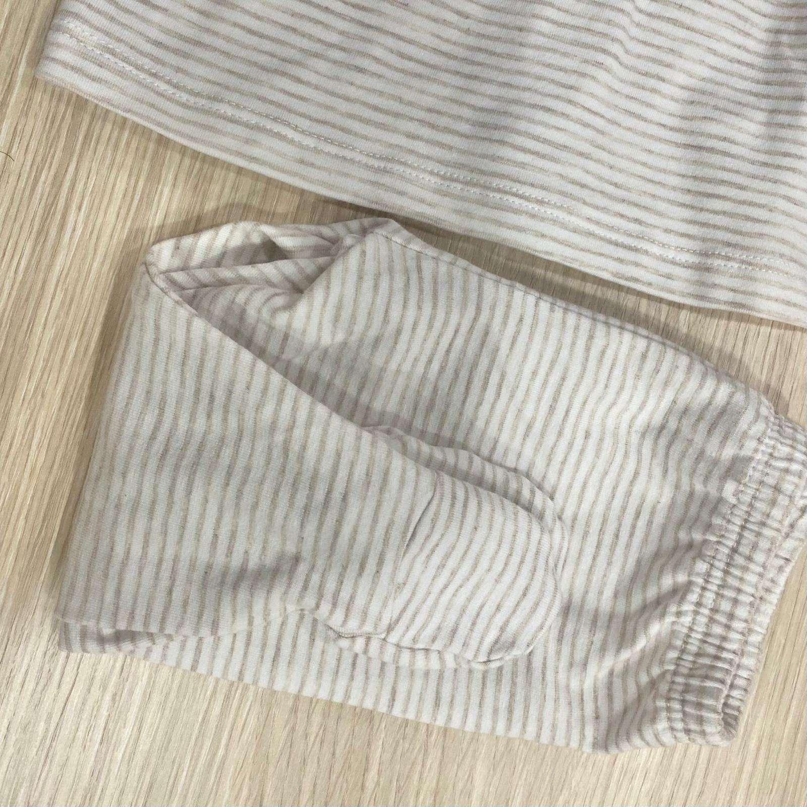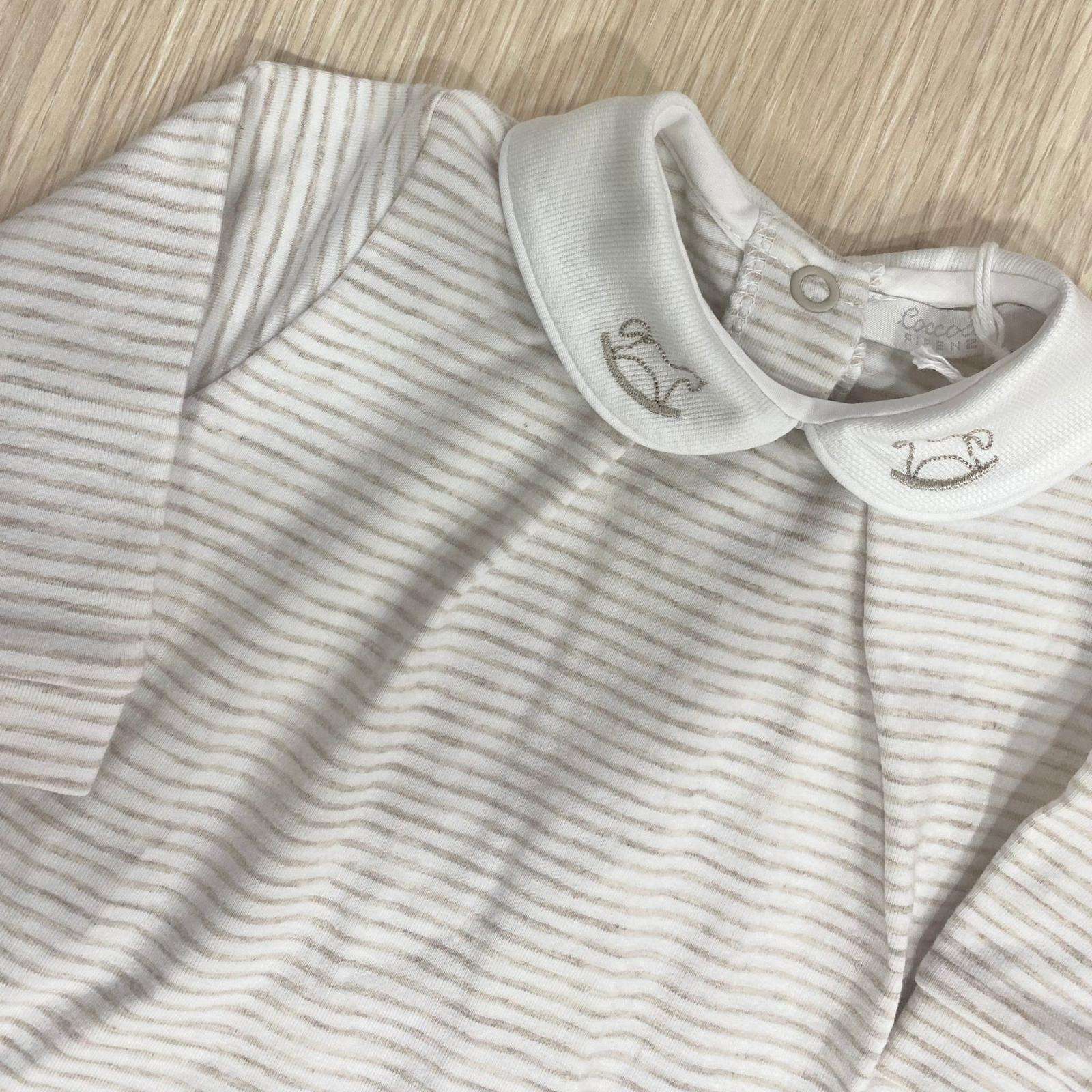 Completino due pezzi neonato in cotone bio, di colore sabbia e bianco, con disegno ricamato sul colletto.
