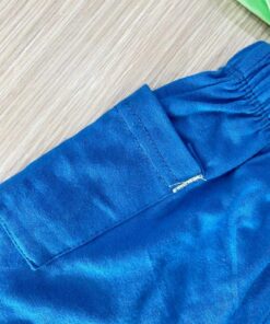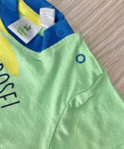 Completino due pezzi neonato in cotone, di colore blu chiaro e verde mela, con stampa di vari colori.
