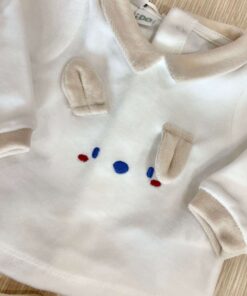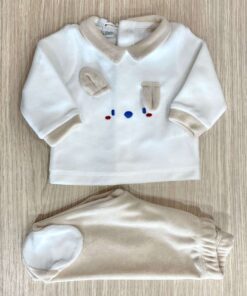 Completino due pezzi neonato in ciniglia, di colore beige e panna, con disegno ricamato e dettaglio in rilievo.