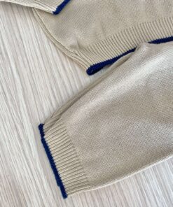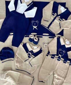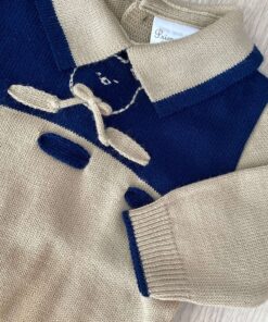 Completino due pezzi neonato in lana, di colore corda e blu, con dettaglio teddy.