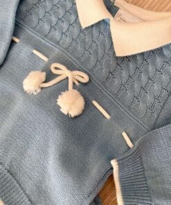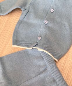 Completino due pezzi neonato in lana, di colore celeste e panna, con dettaglio in rilievo.