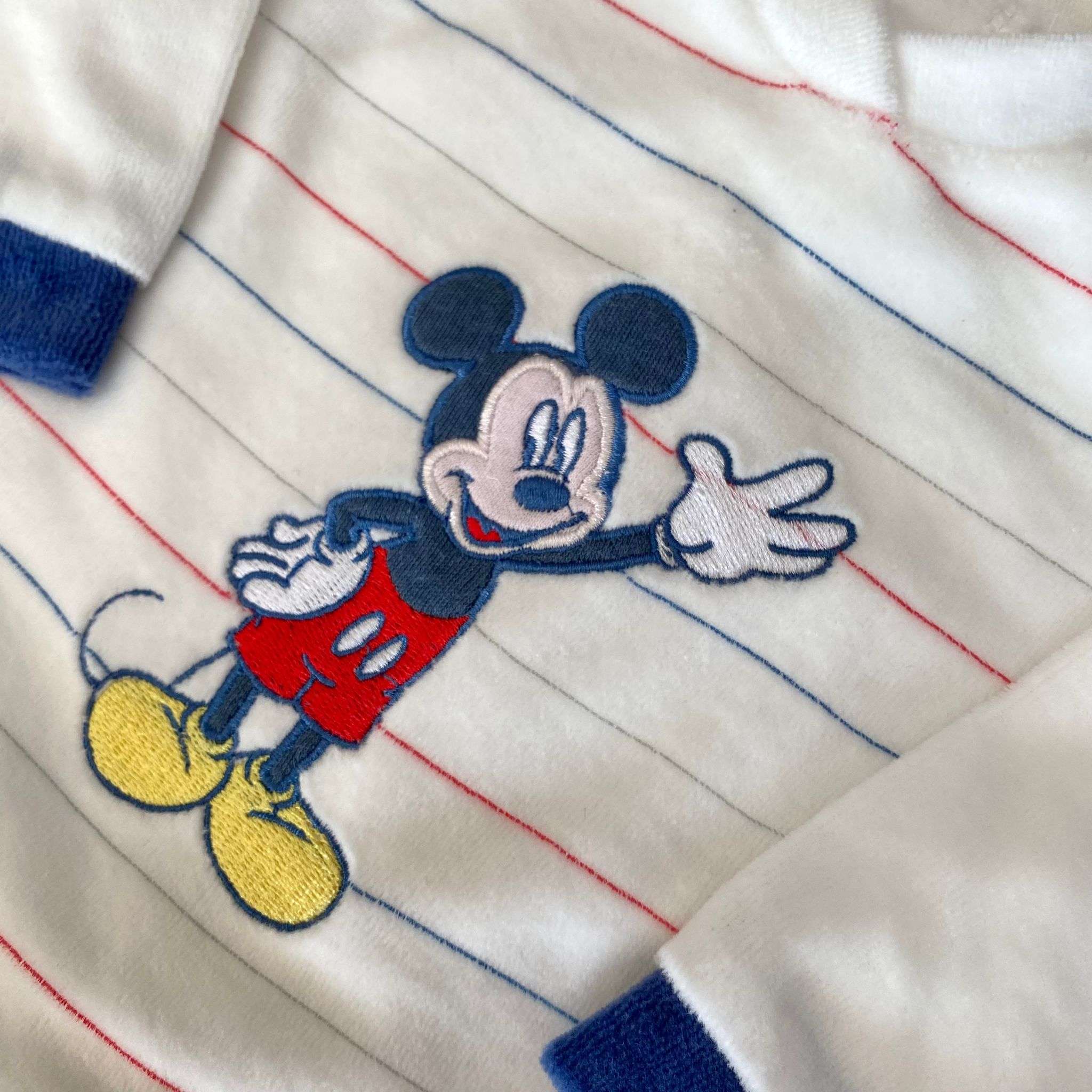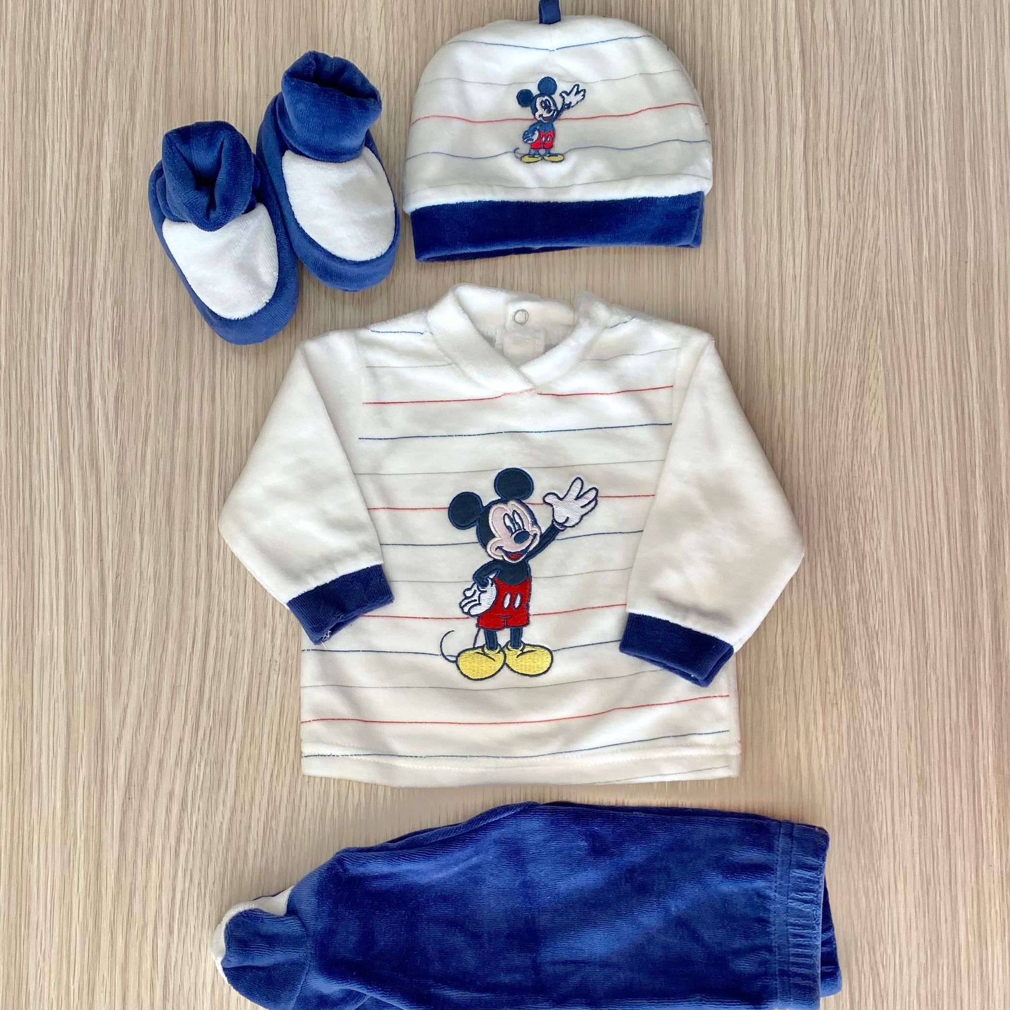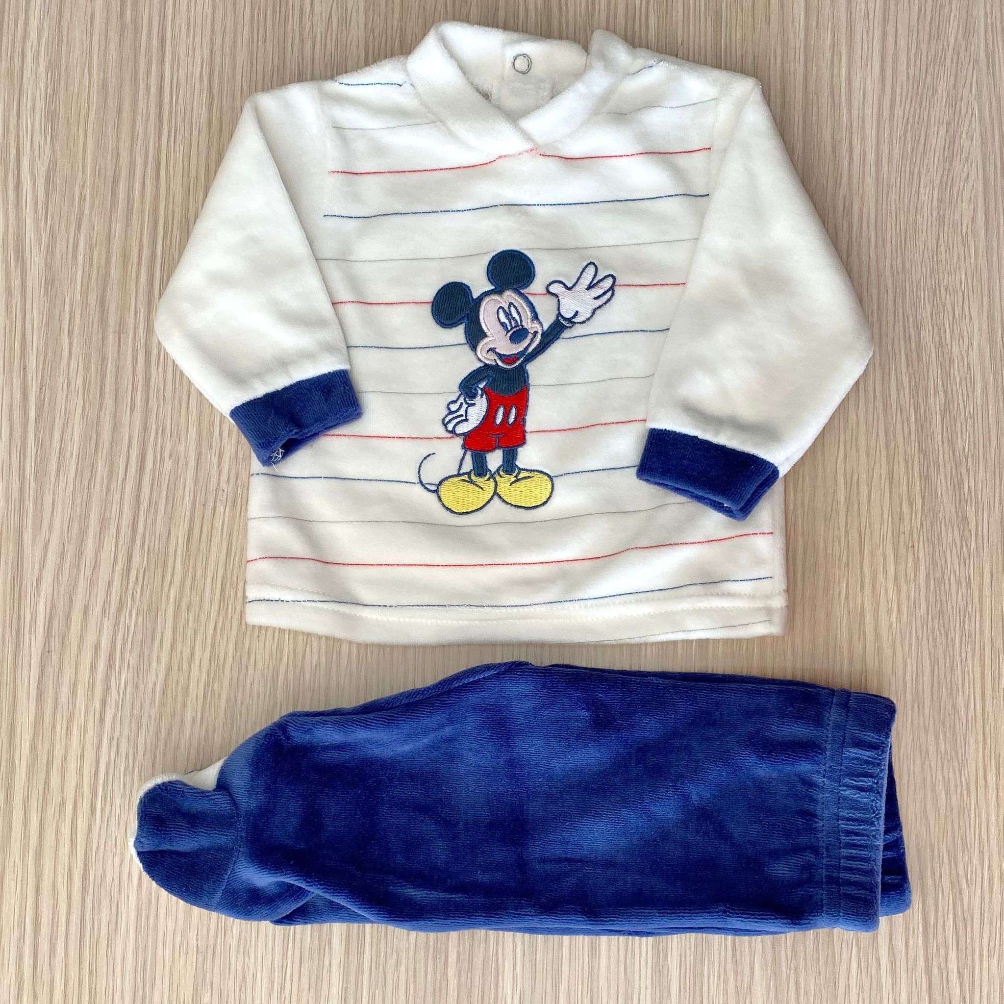 Completino due pezzi neonato in ciniglia, di colore panna e blu, con disegno ricamato.