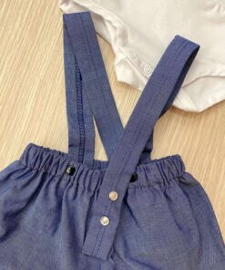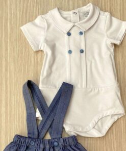 Salopette due pezzi neonato/bambino, di colore blu e bianco, dettaglio di bottoncini.