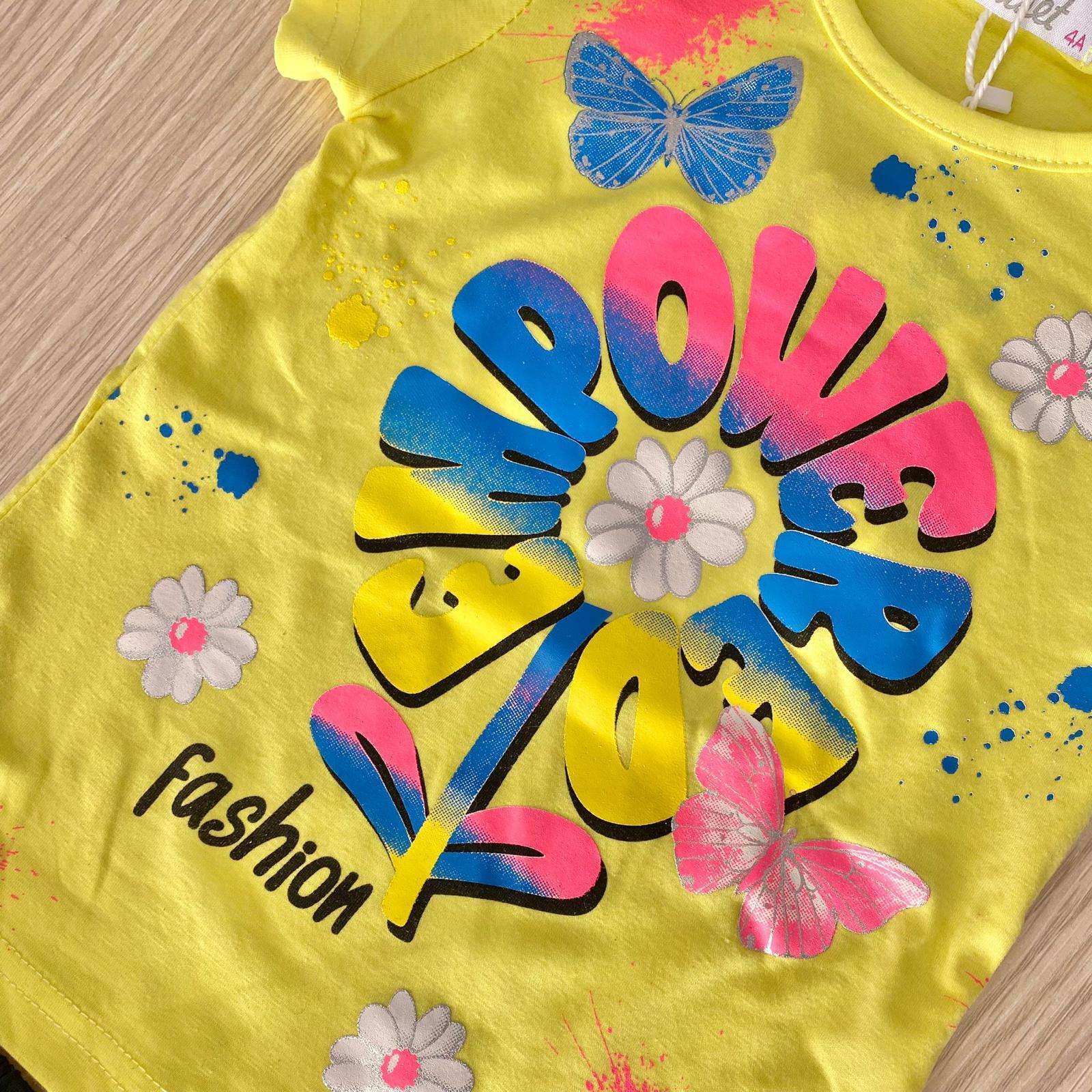 Completo due pezzi bambina in cotone, di colore giallo e nero, con stampa di vari colori.