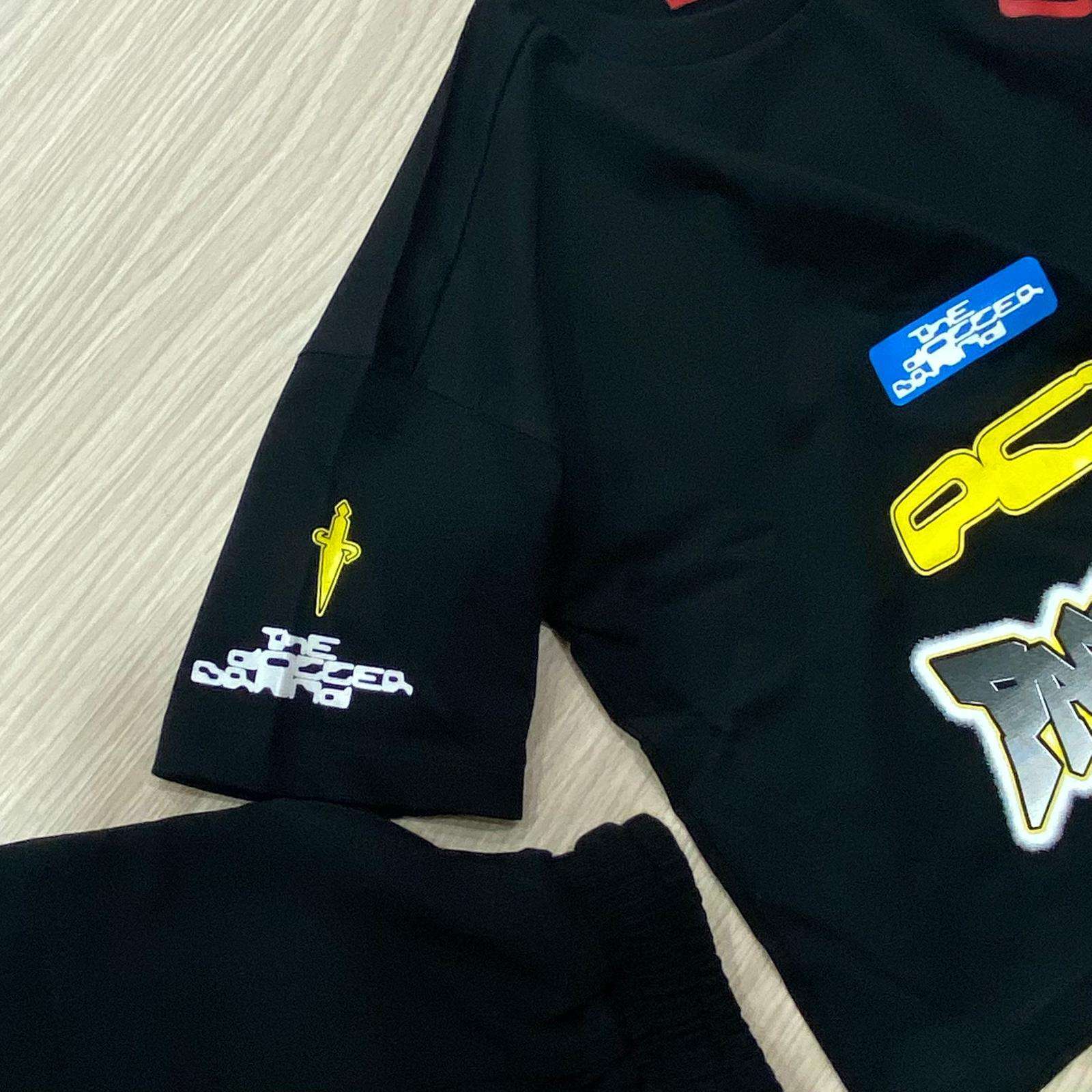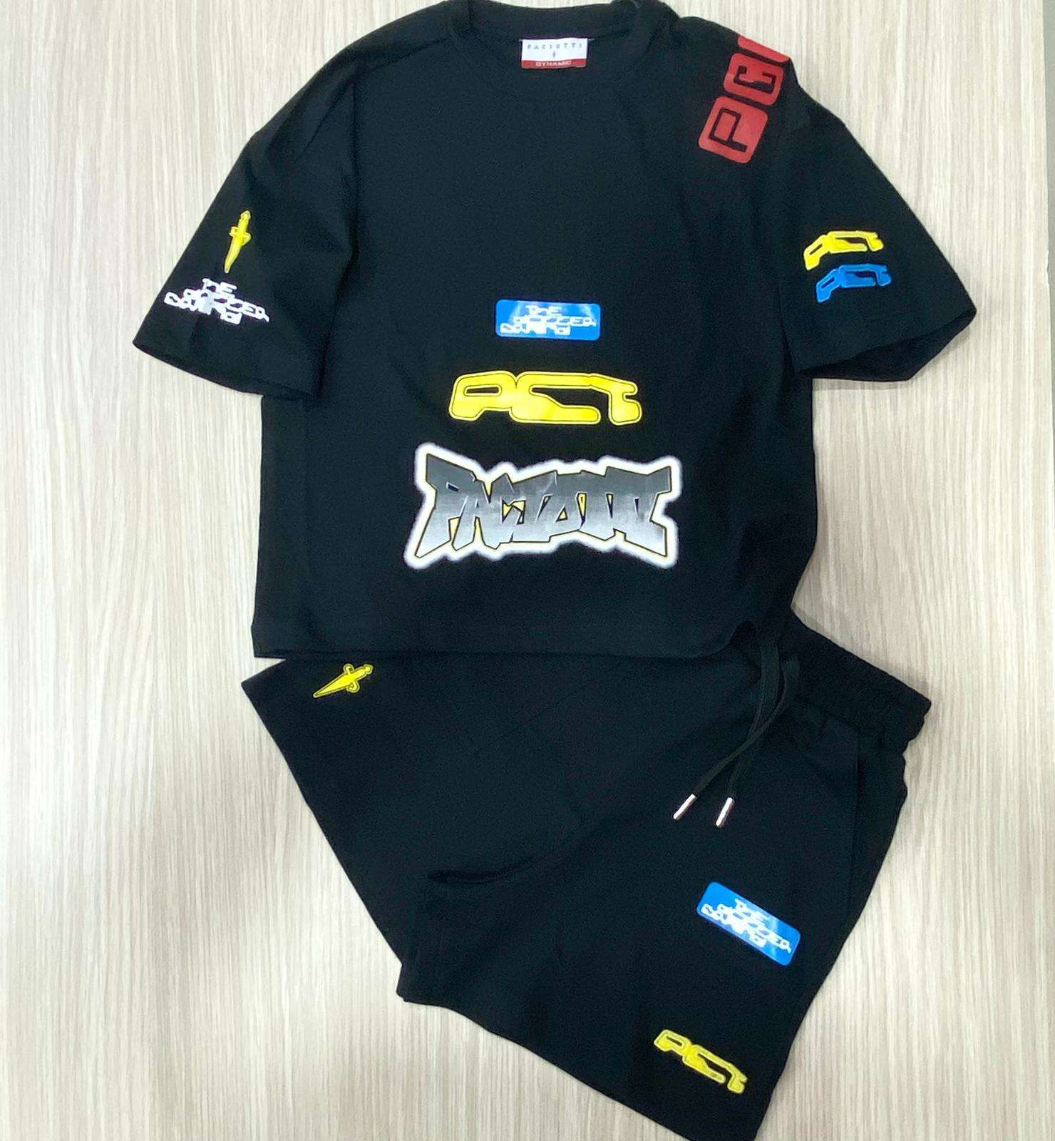 Completo due pezzi firmato Paciotti realizzato in cotone, pensato per chi ama uno stile urbano deciso senza rinunciare alla comodità. Il set è composto da t-shirt a manica corta e pantaloncino coordinato, entrambi in tonalità nera con applicazioni grafiche colorate che donano carattere e personalità al look.