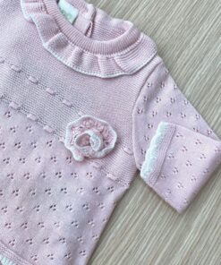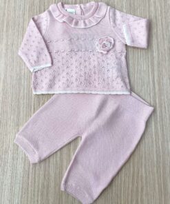 Completo due pezzi in filo di colore rosa con dettagli bianco, applicazione bellissima rosa che lo rende romantico.
