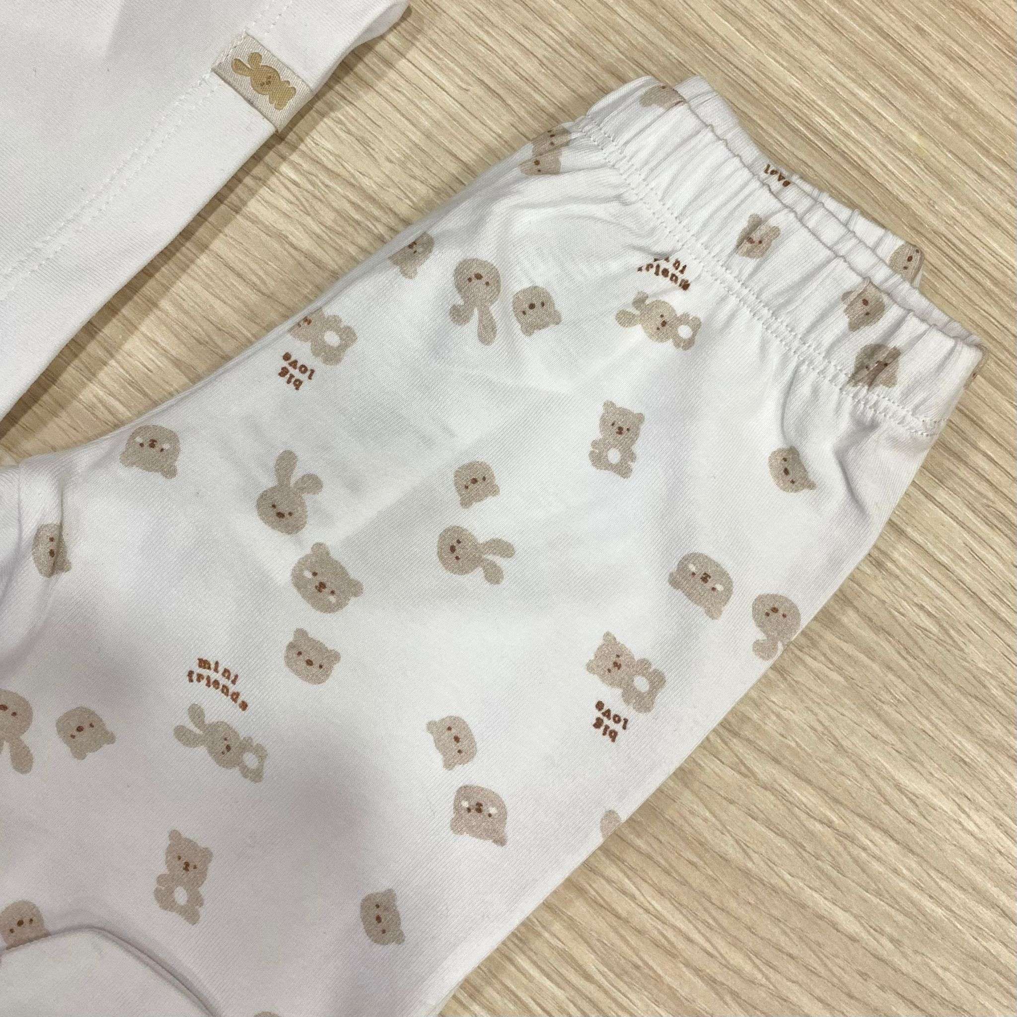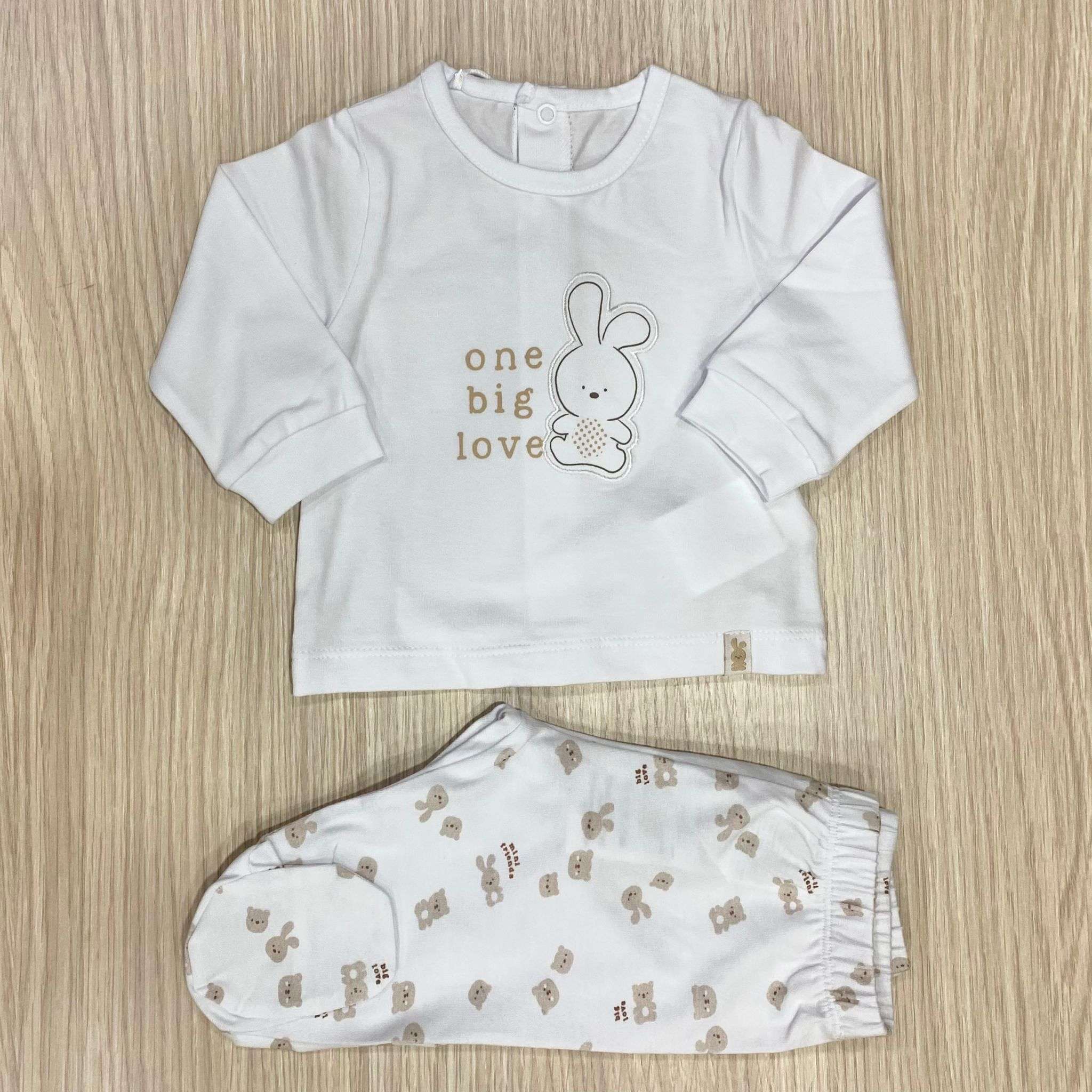 Completo due pezzi neonato/a in cotone, di colore bianco e beige, con disegni e scritta di vari colori.