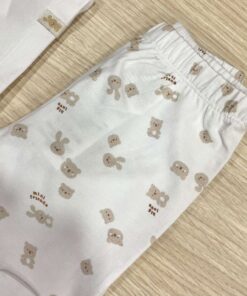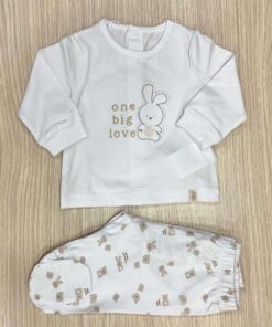 Completo due pezzi neonato/a in cotone, di colore bianco e beige, con disegni e scritta di vari colori.