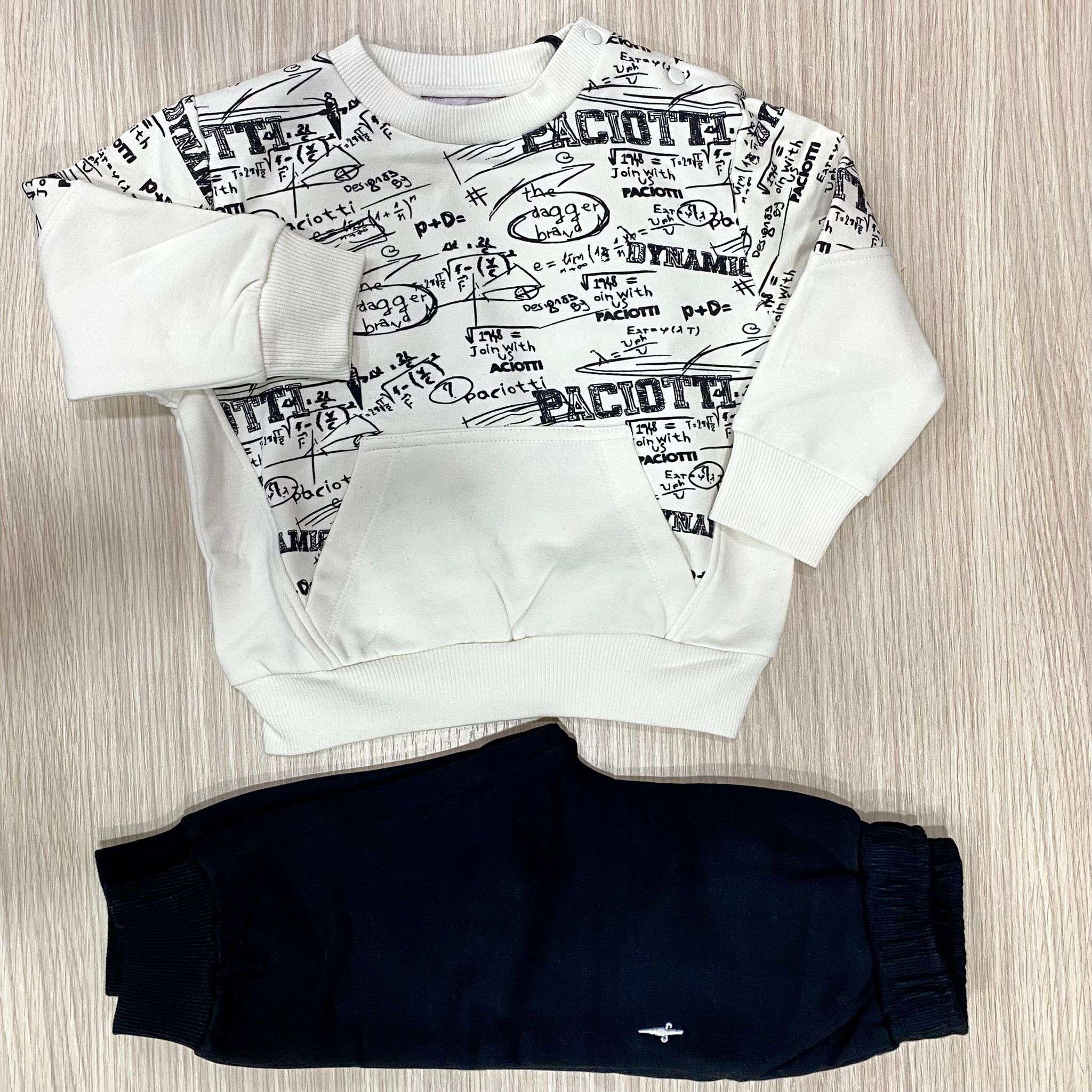 Completo due pezzi neonato/bambino in cotone felpato, di colore panna e nero, con dettaglio di tasca unica.