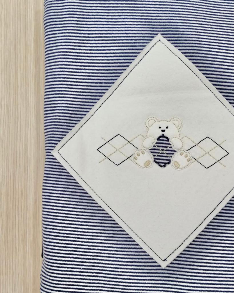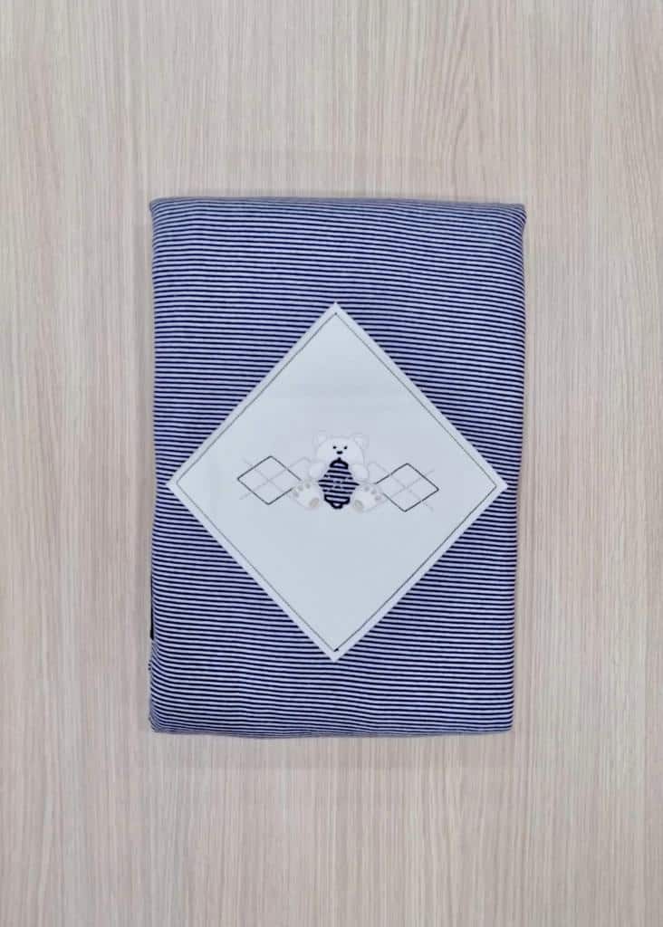 Copertina neonato, in caldo cotone e morbidissima imbottitura, di colore blu e dettagli di colore panna.