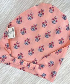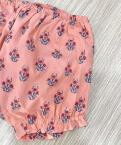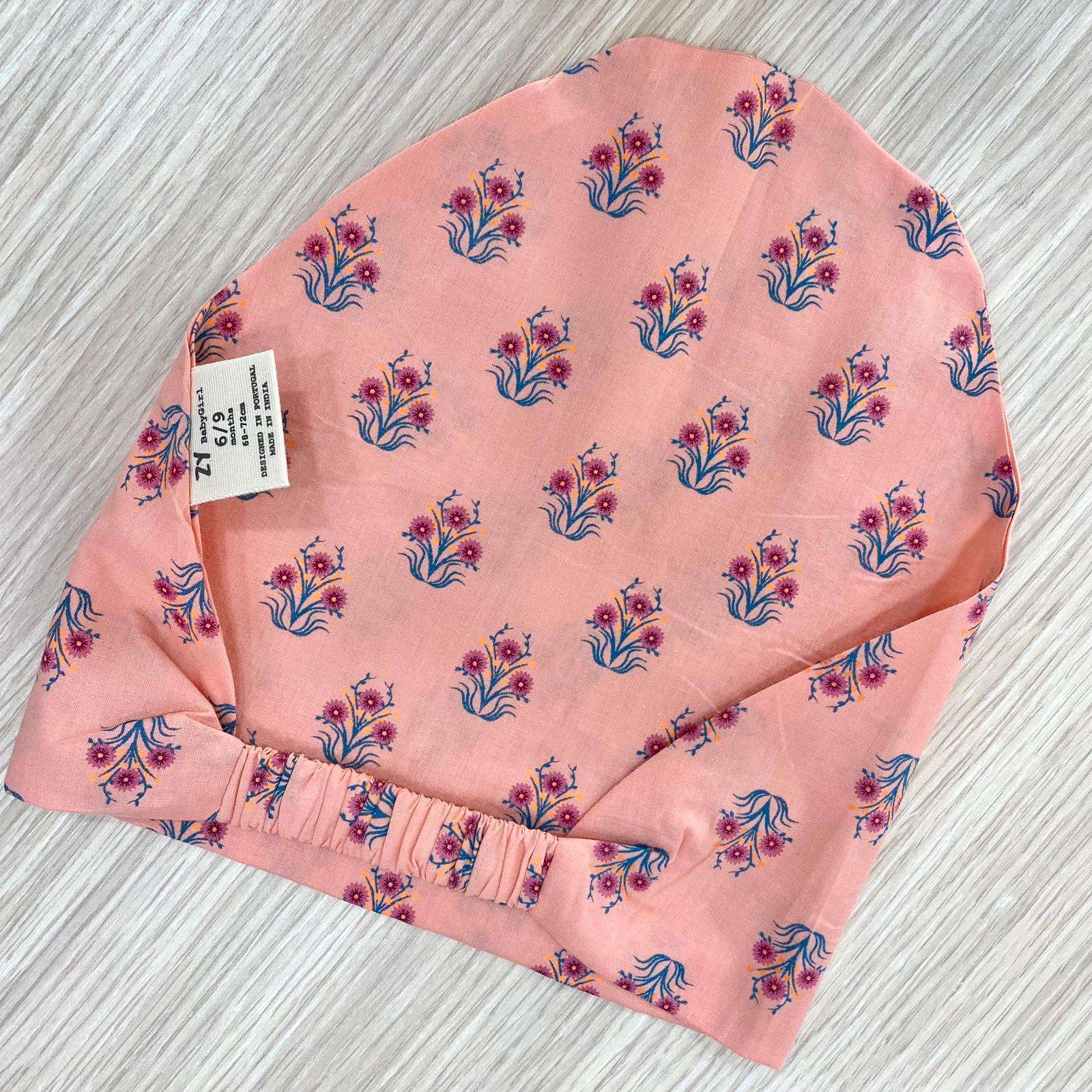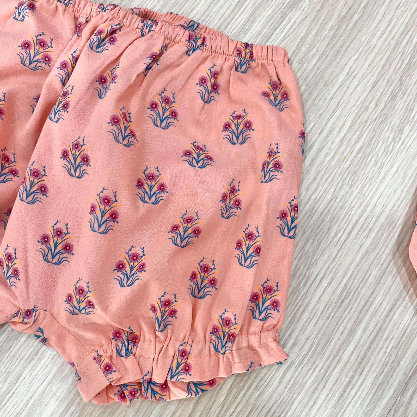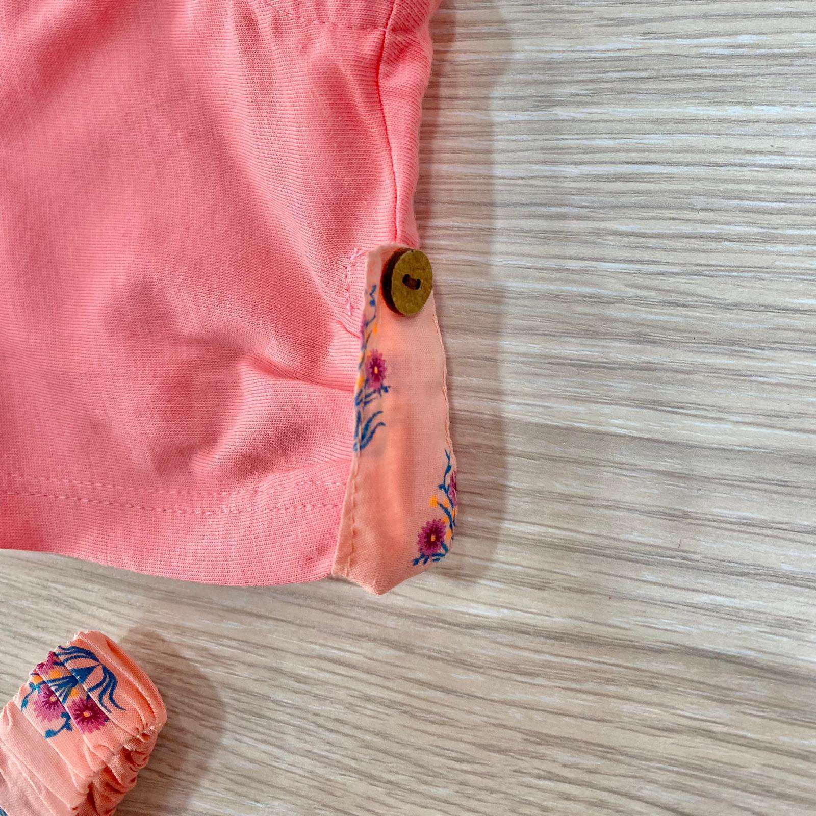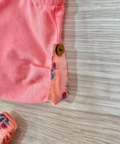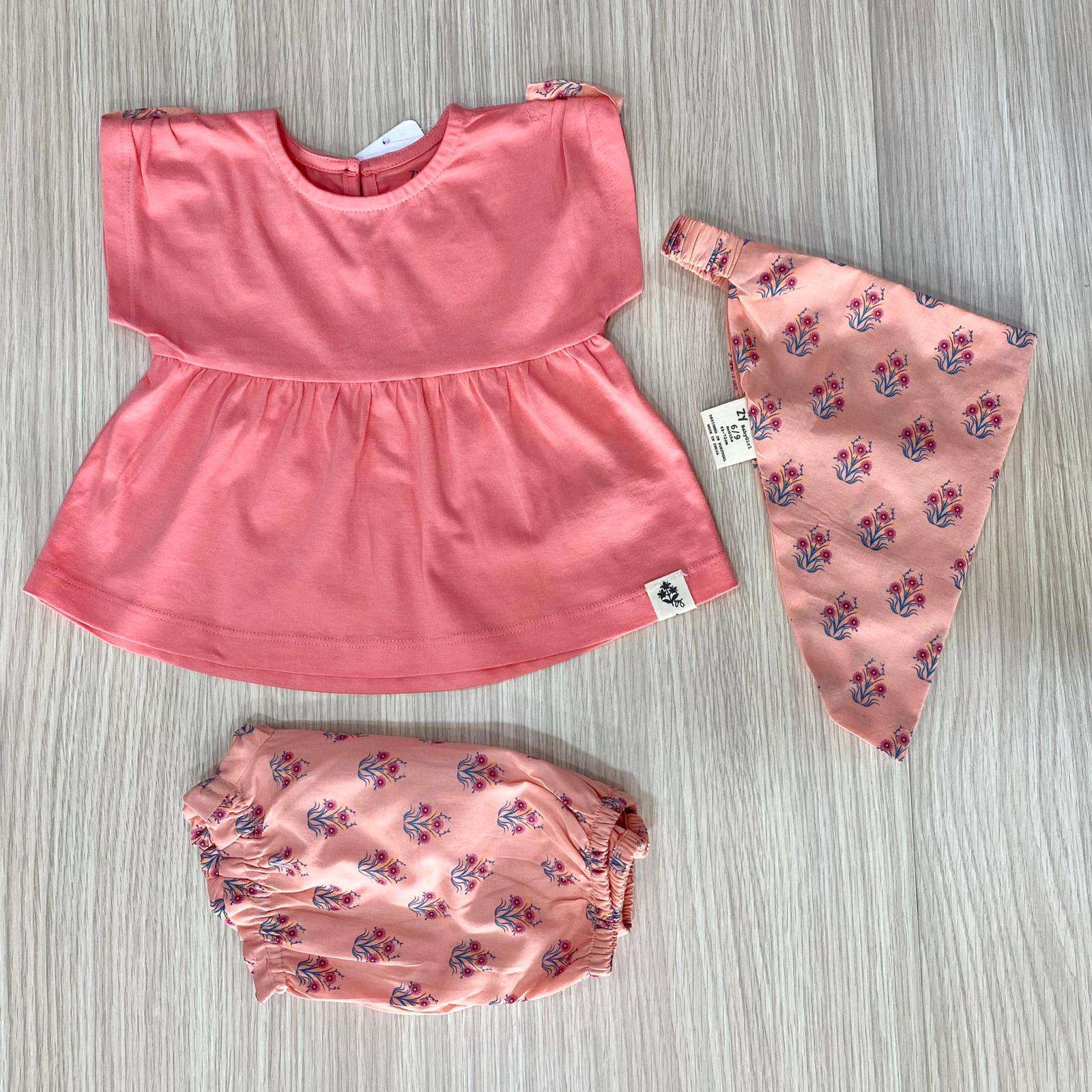Completo tre pezzi bambina in cotone, di colore salmone, con dettagli di vari colori.