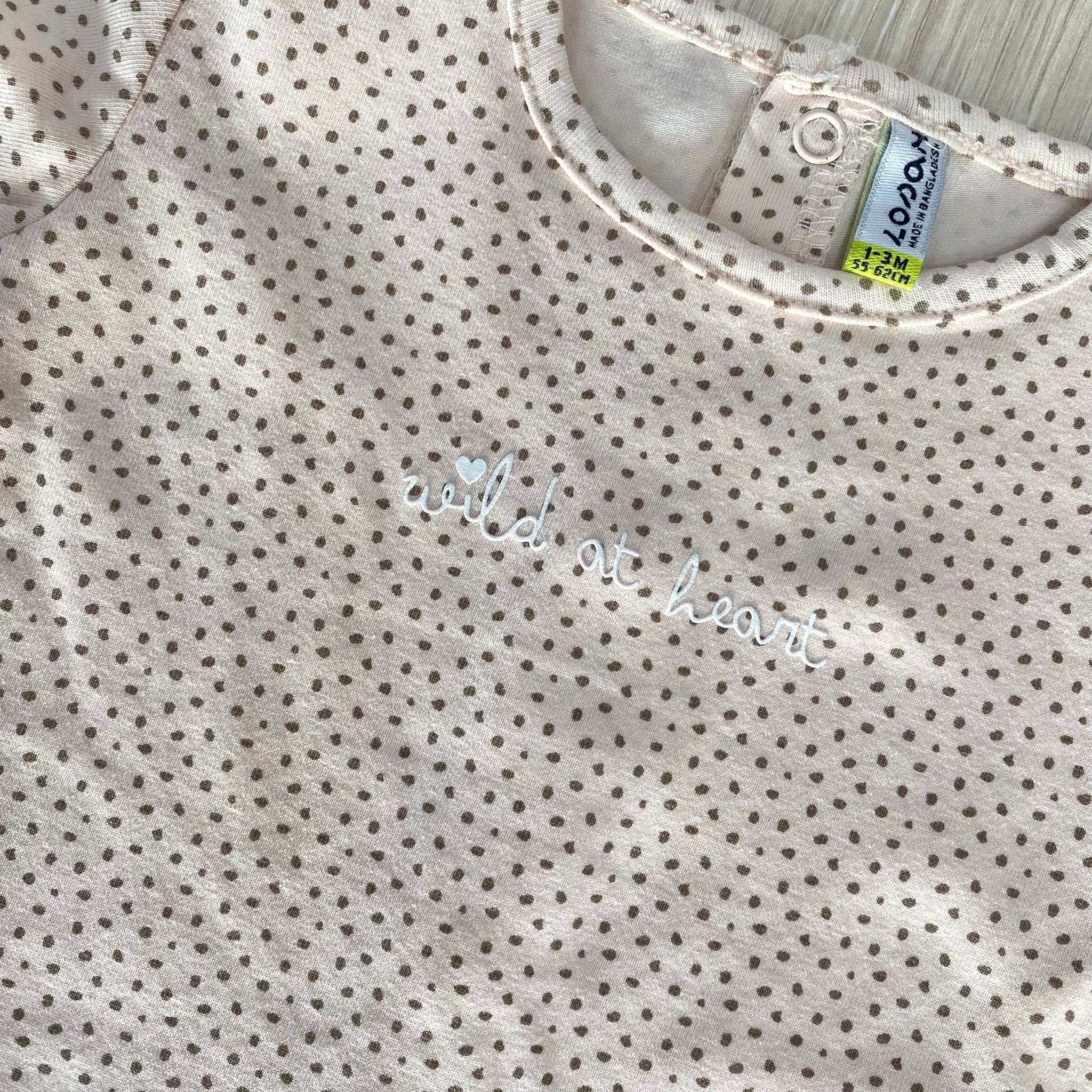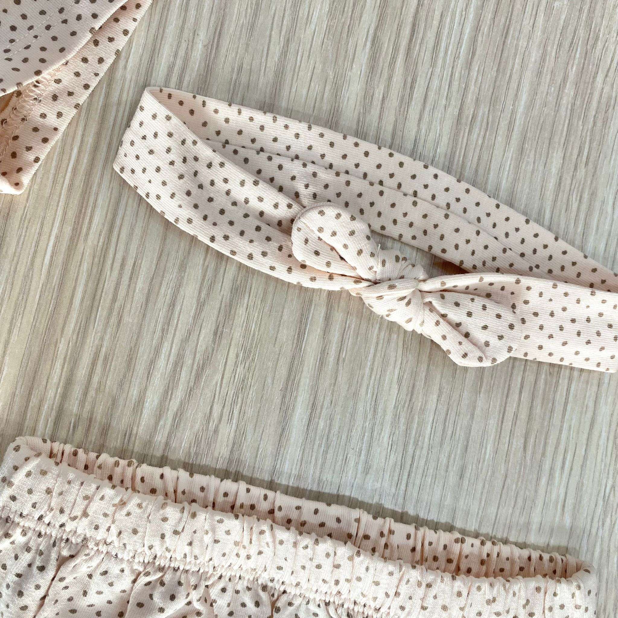 Completo tre pezzi neonata/bambina in cotone, di colore salmone e pois di colore marroncino.