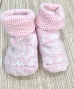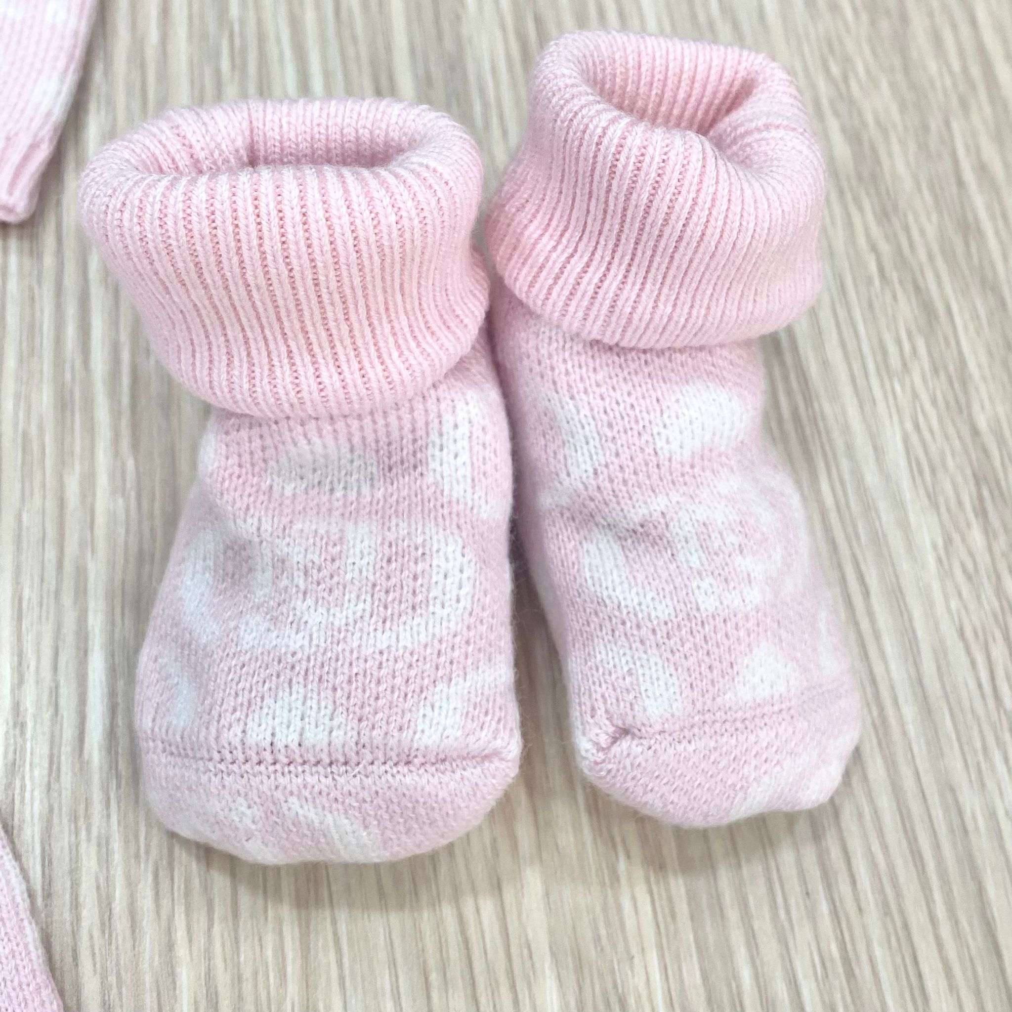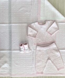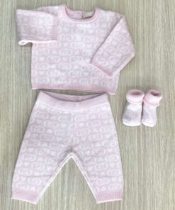 Completo tre pezzi neonata in caldo cotone, di colore rosa e panna, con disegni di loghi e cuoricini. Completo composto da: maglia, pantalone e babbucce. Apertura con bottoncini.