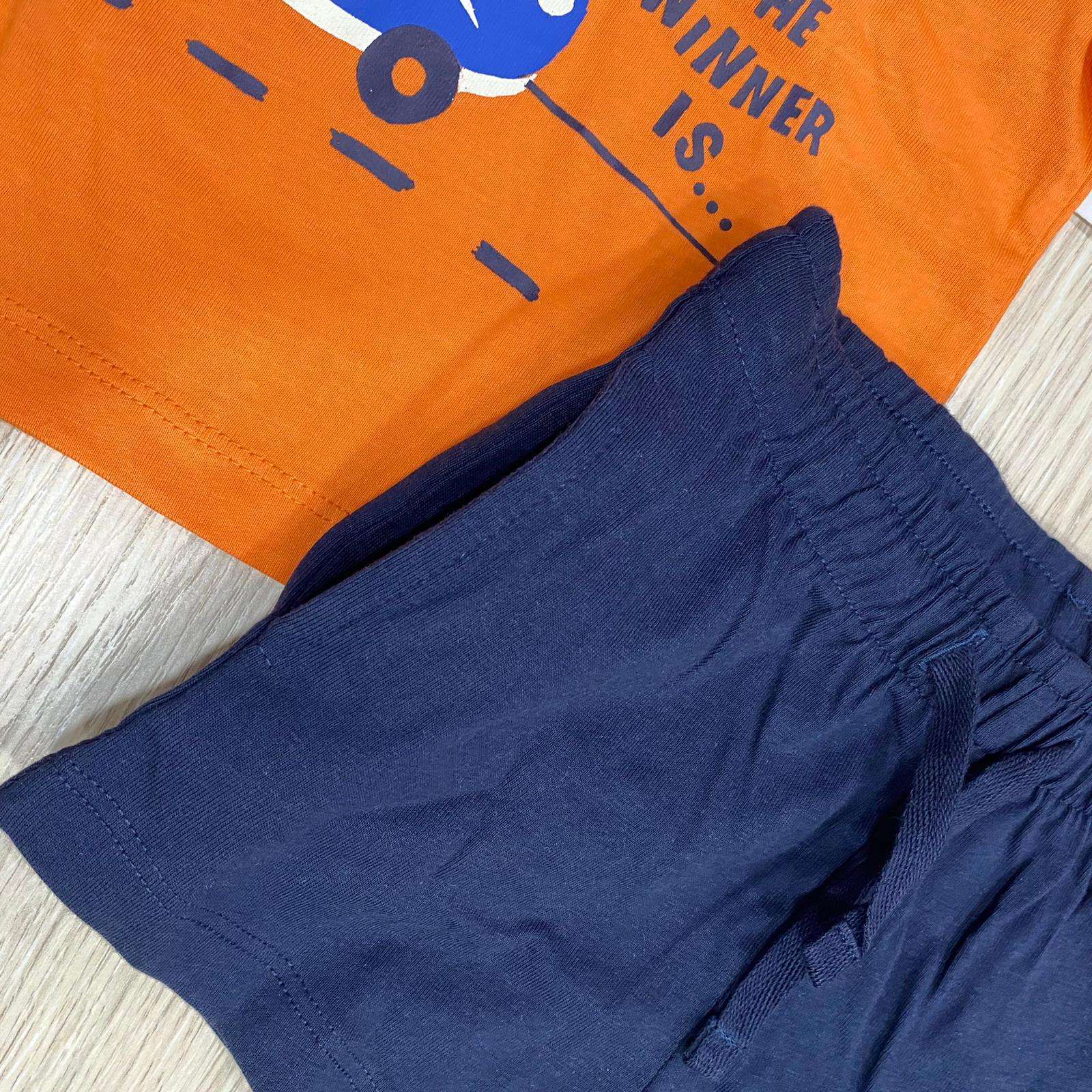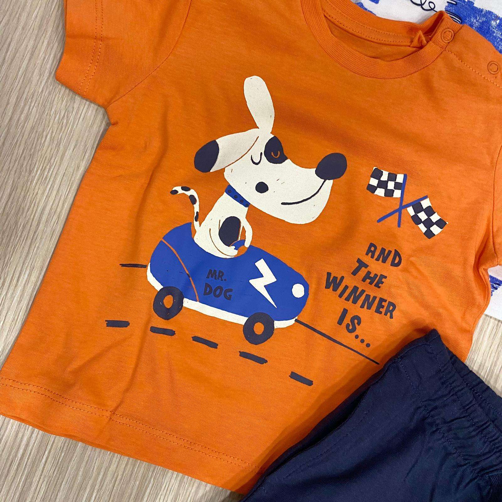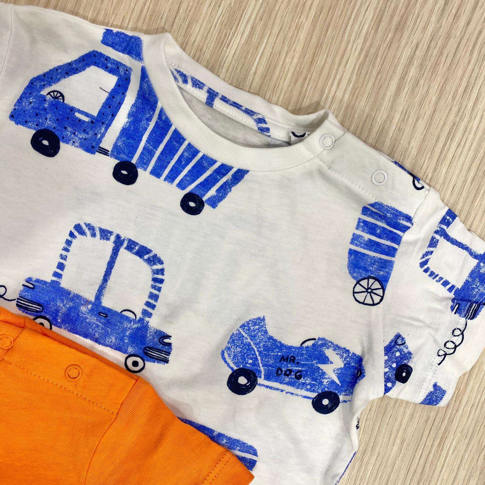 Completo tre pezzi neonato/bambino in cotone, di colore arancione, blu e bianco, con stampa di vari colori.
