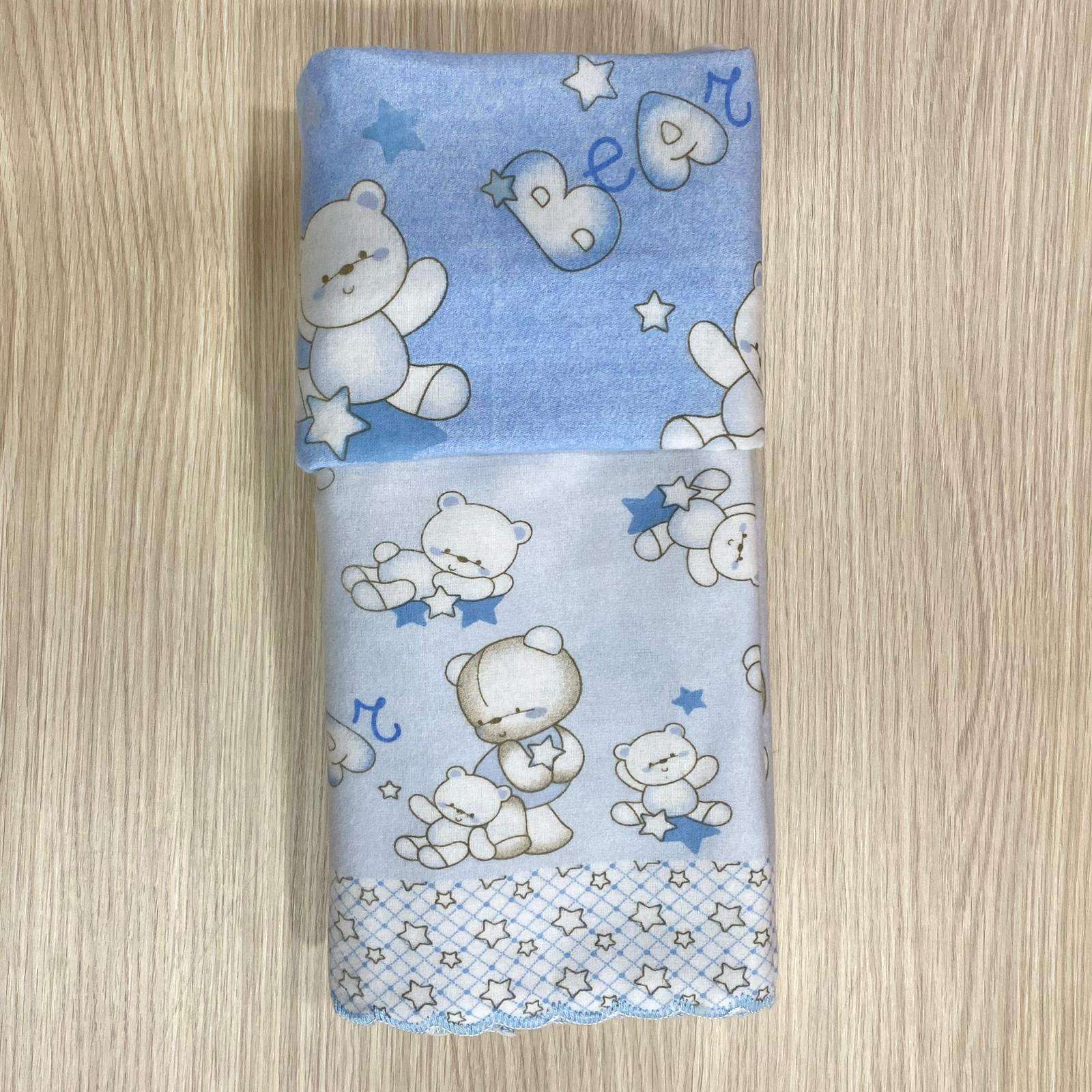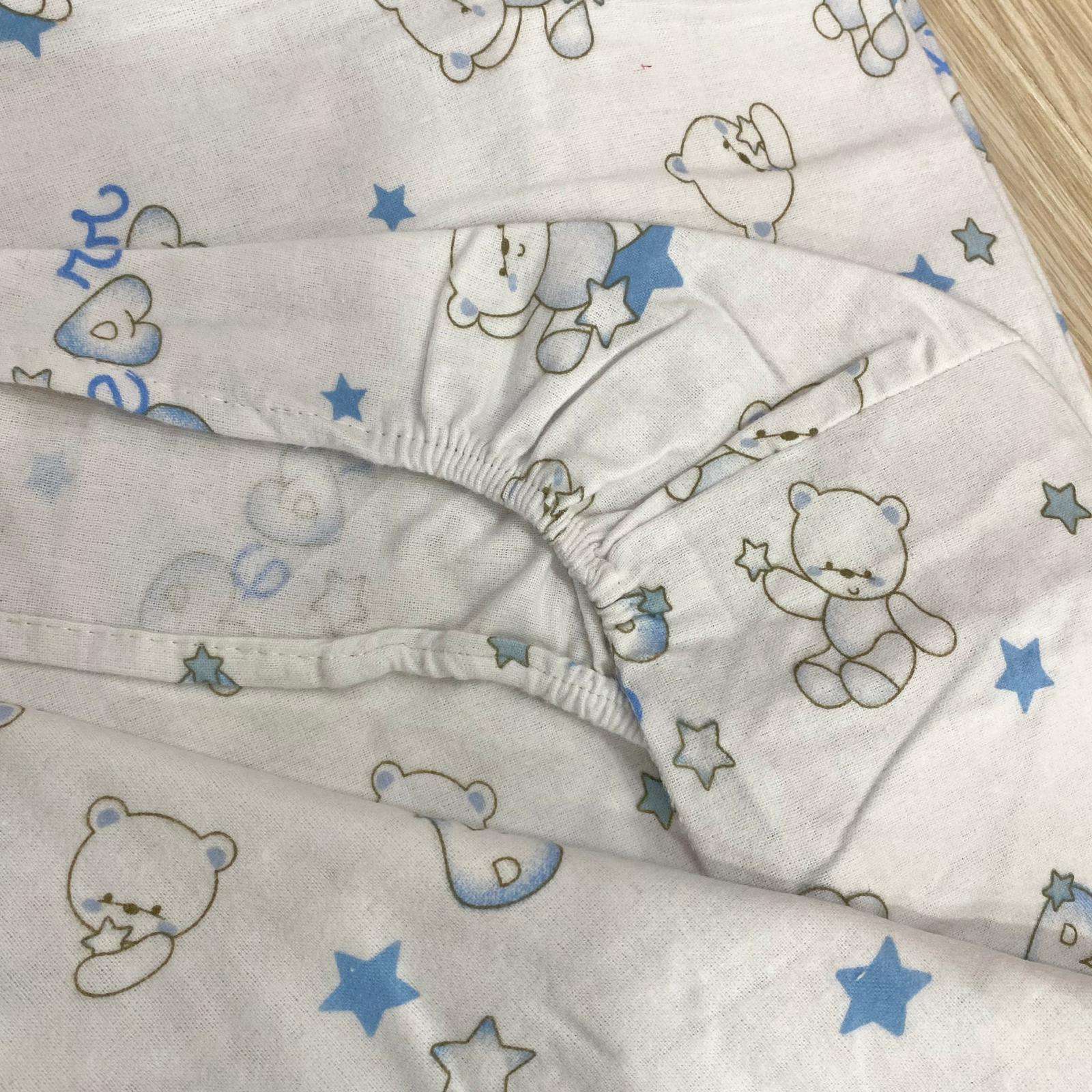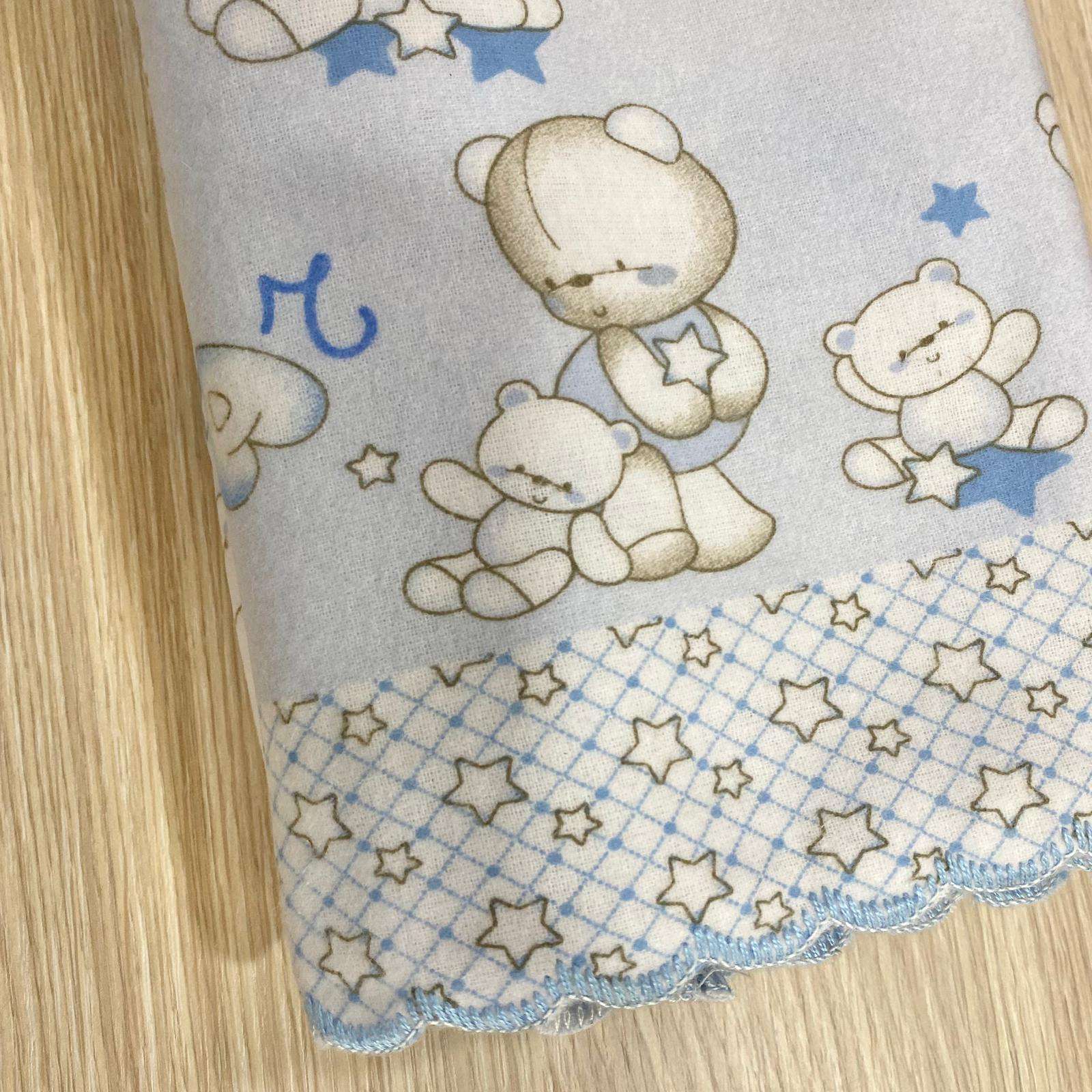 Composè lettino/culla grande in flanella, di colore azzurro e panna con dettagli di vari colori.
