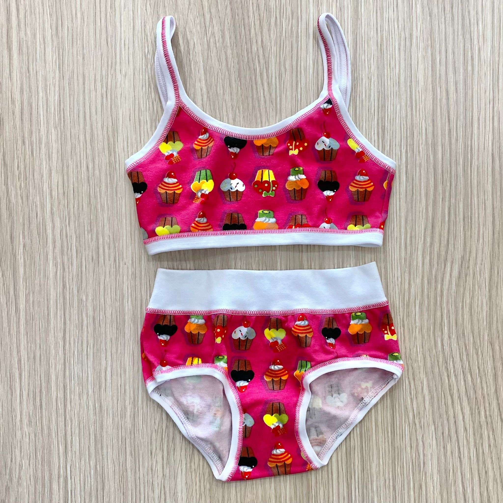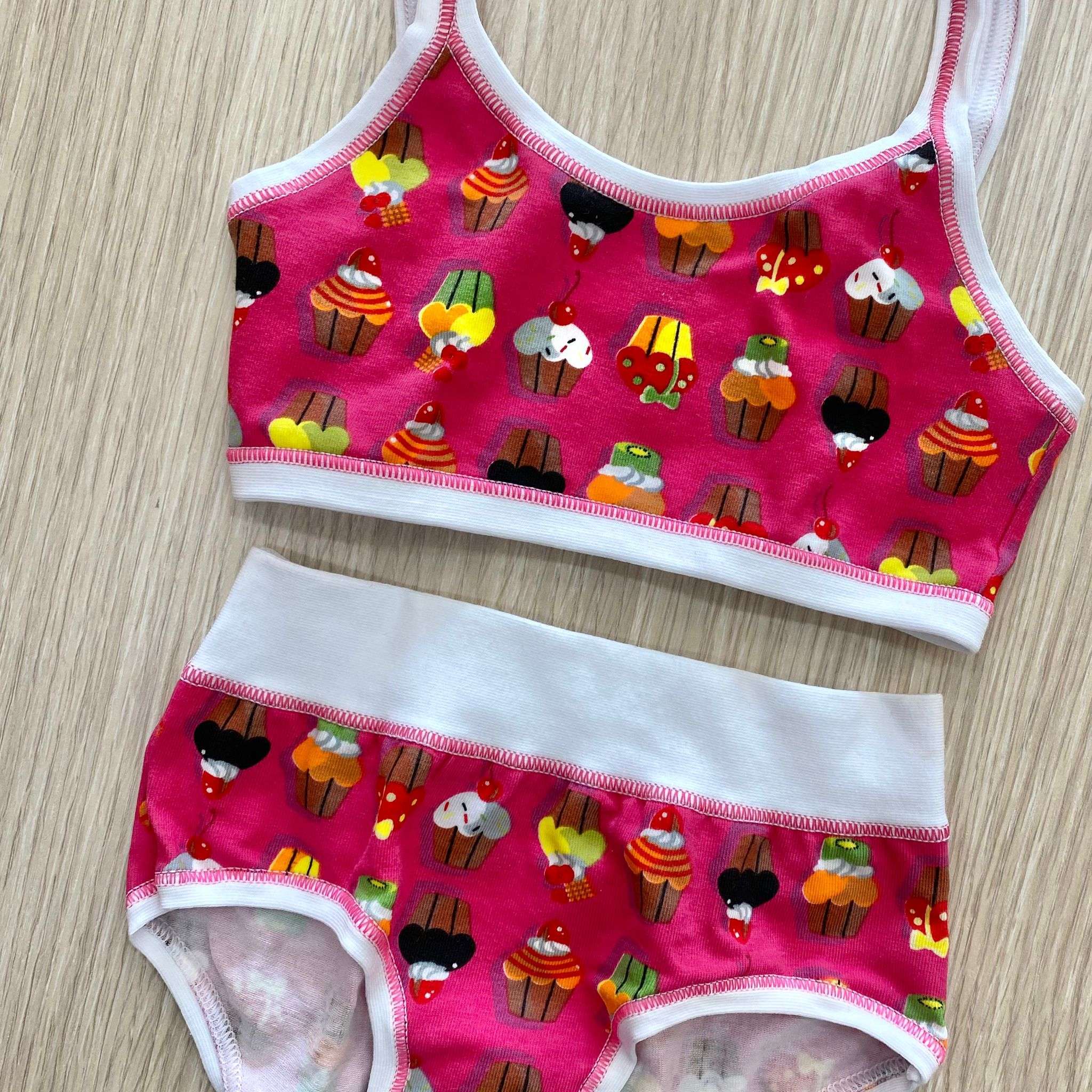 Coordinato bralette e slip bambina con fondo fucsia e stampa di vari colori e dettaglio in bianco.