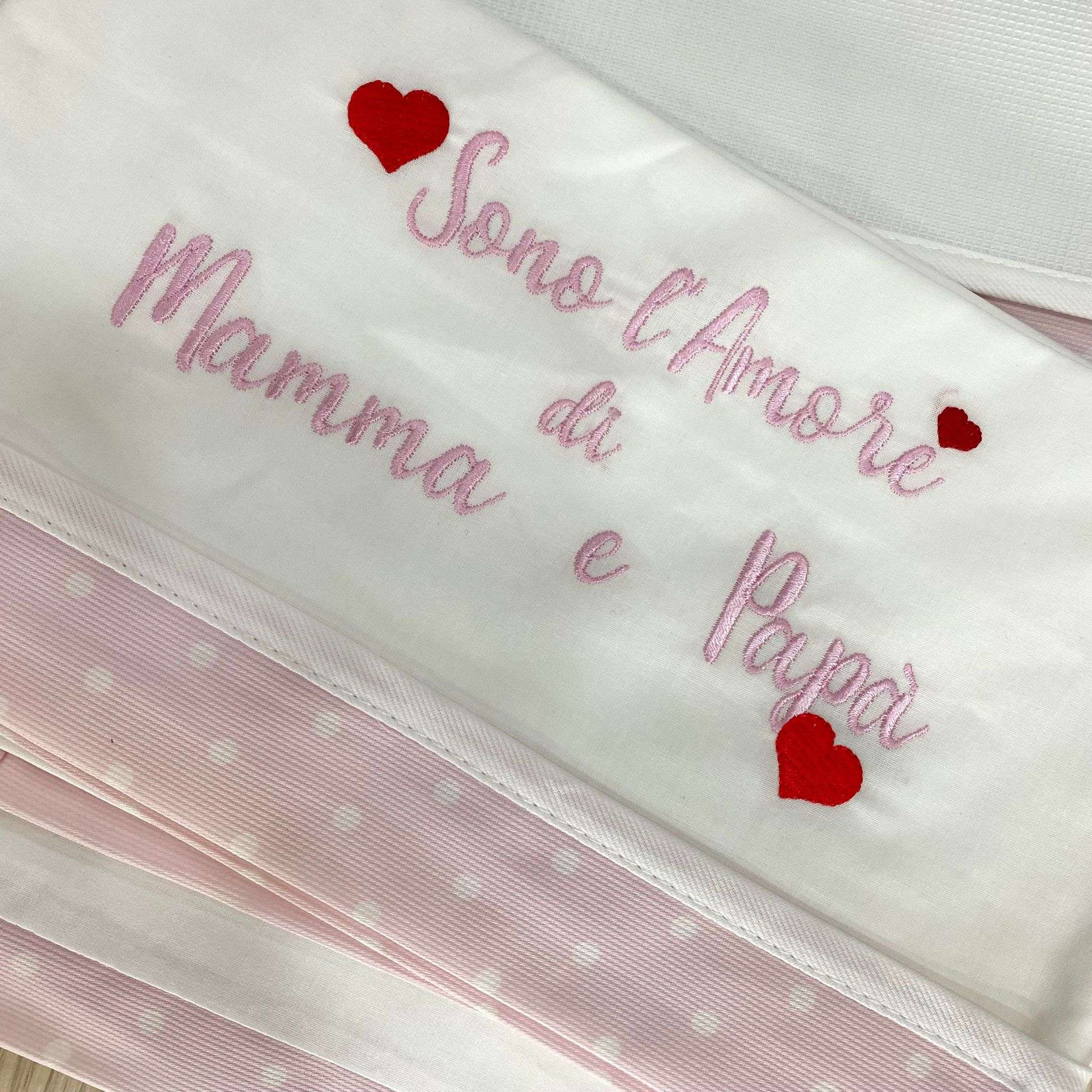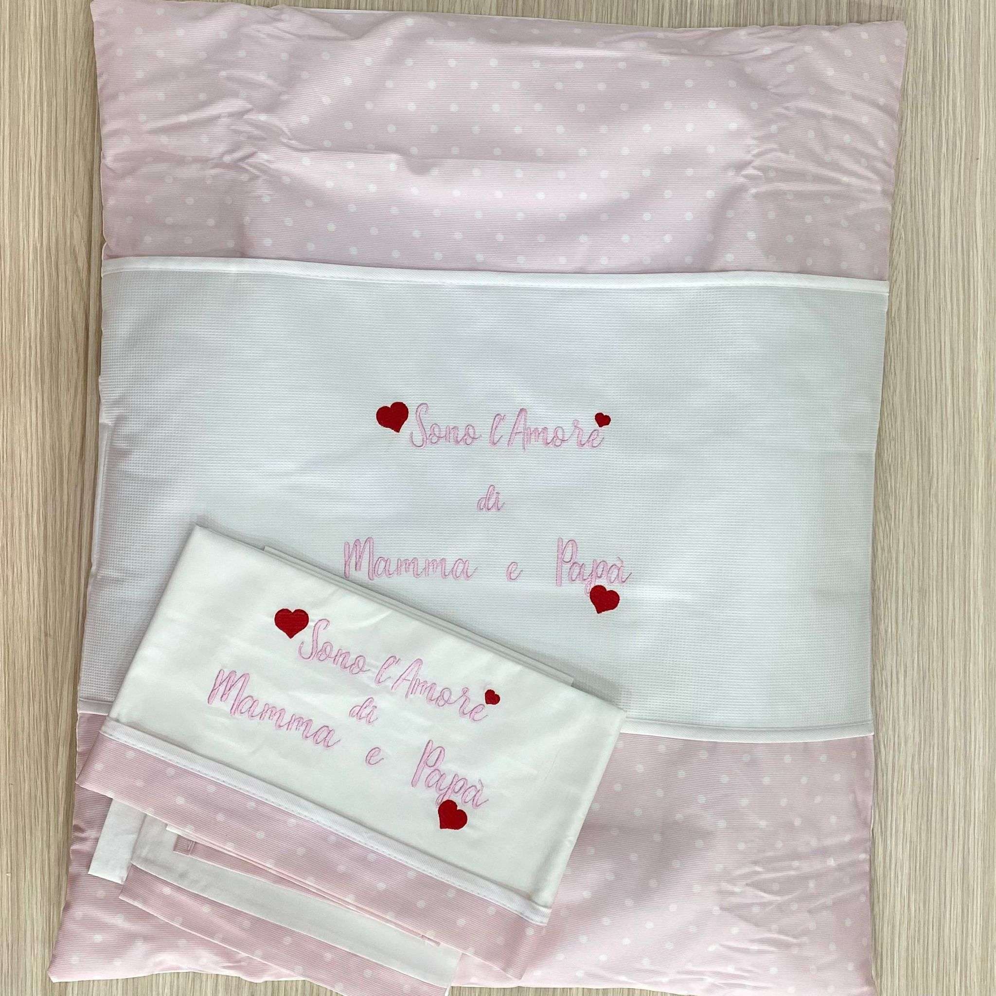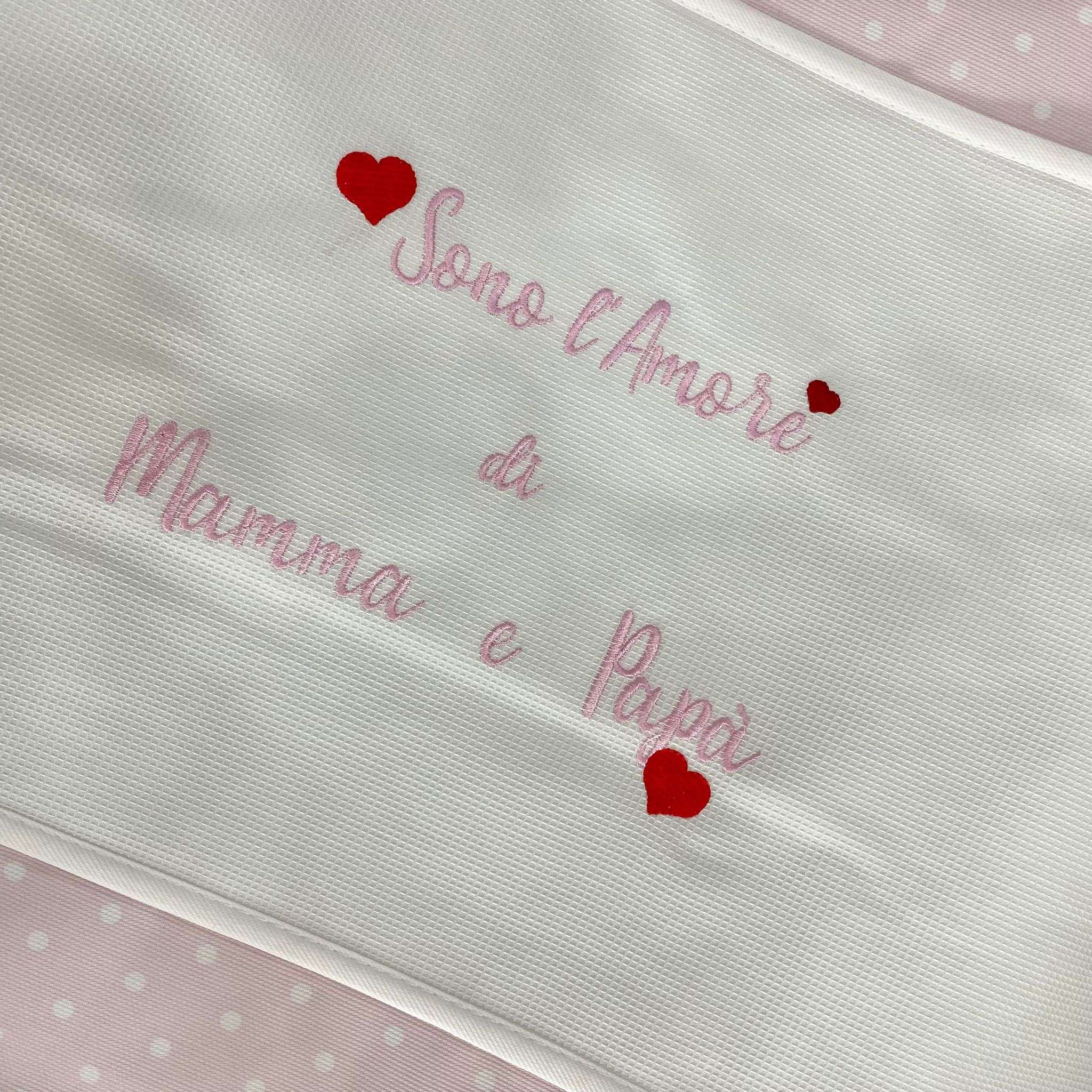 Coordinato sfoderabile culla/carrozzina di colore panna e rosa, con scritta ricamata.