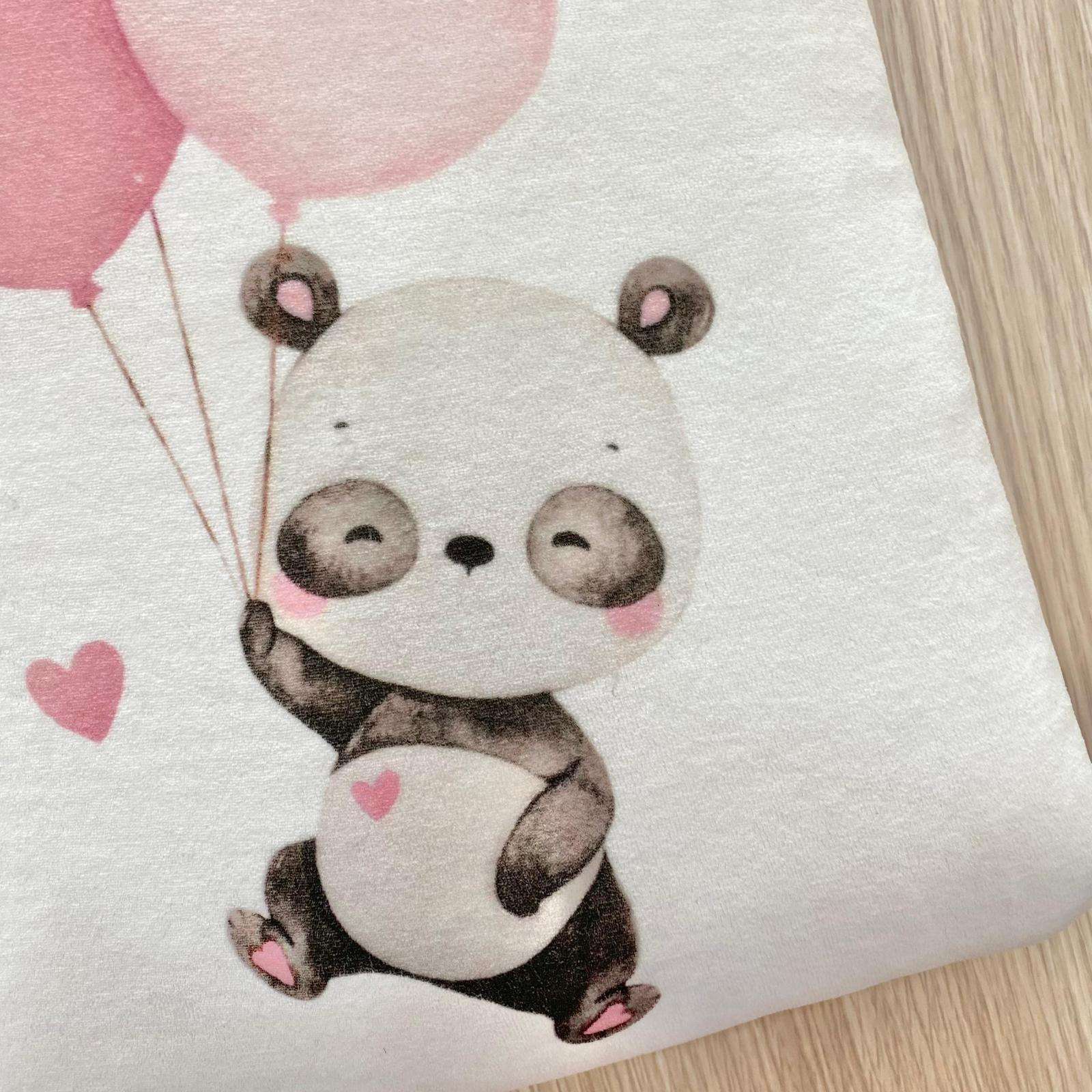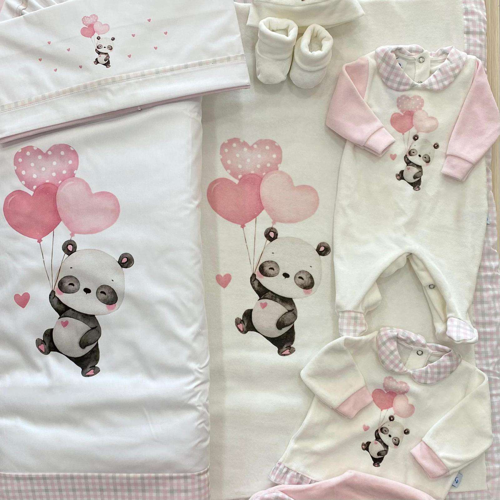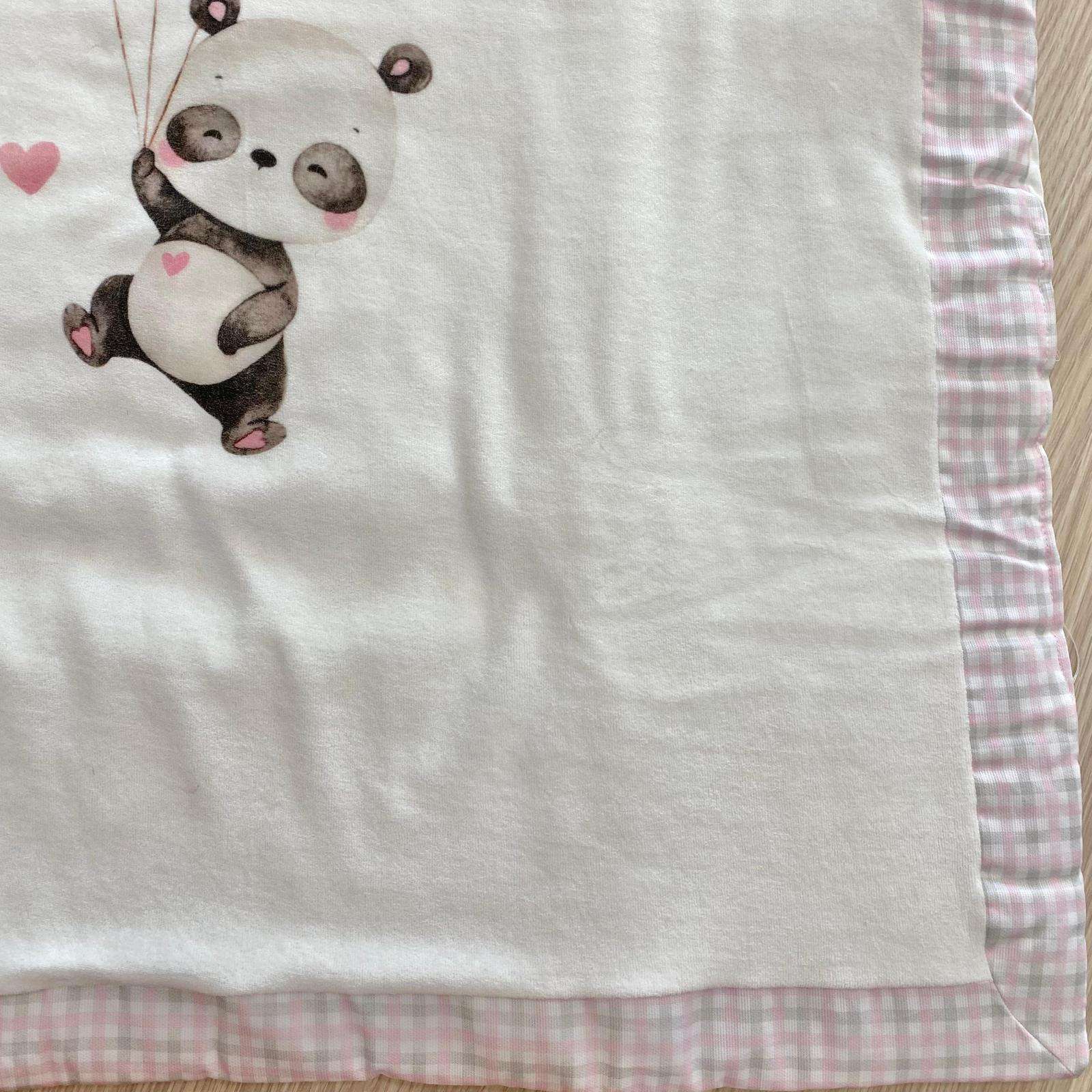 Copertina culla/carrozzina neonata in ciniglia,di colore latte e rosa con dettagli e disegni di vari colori.