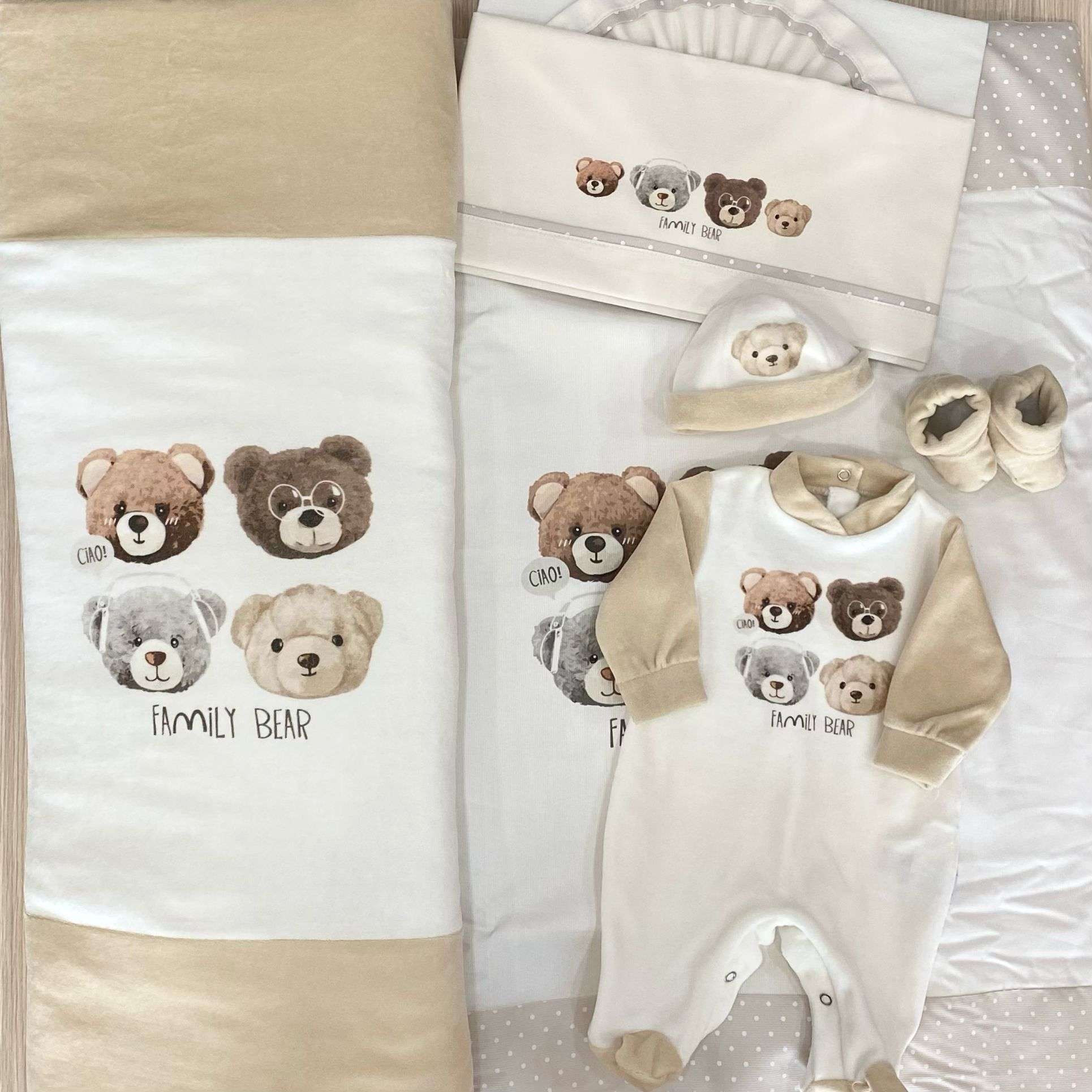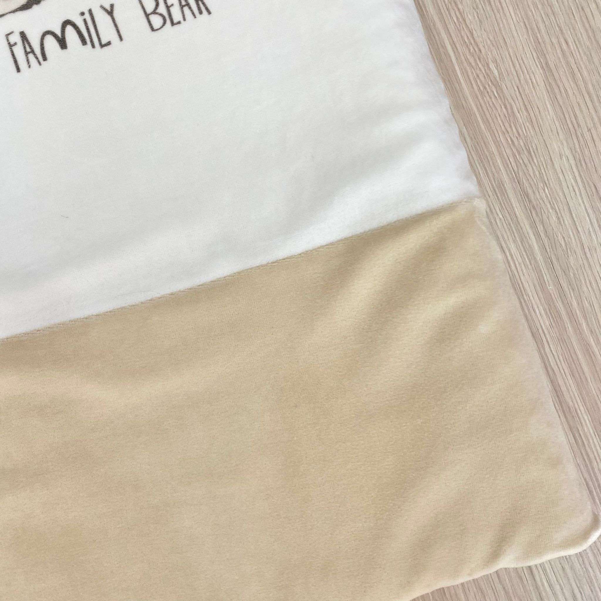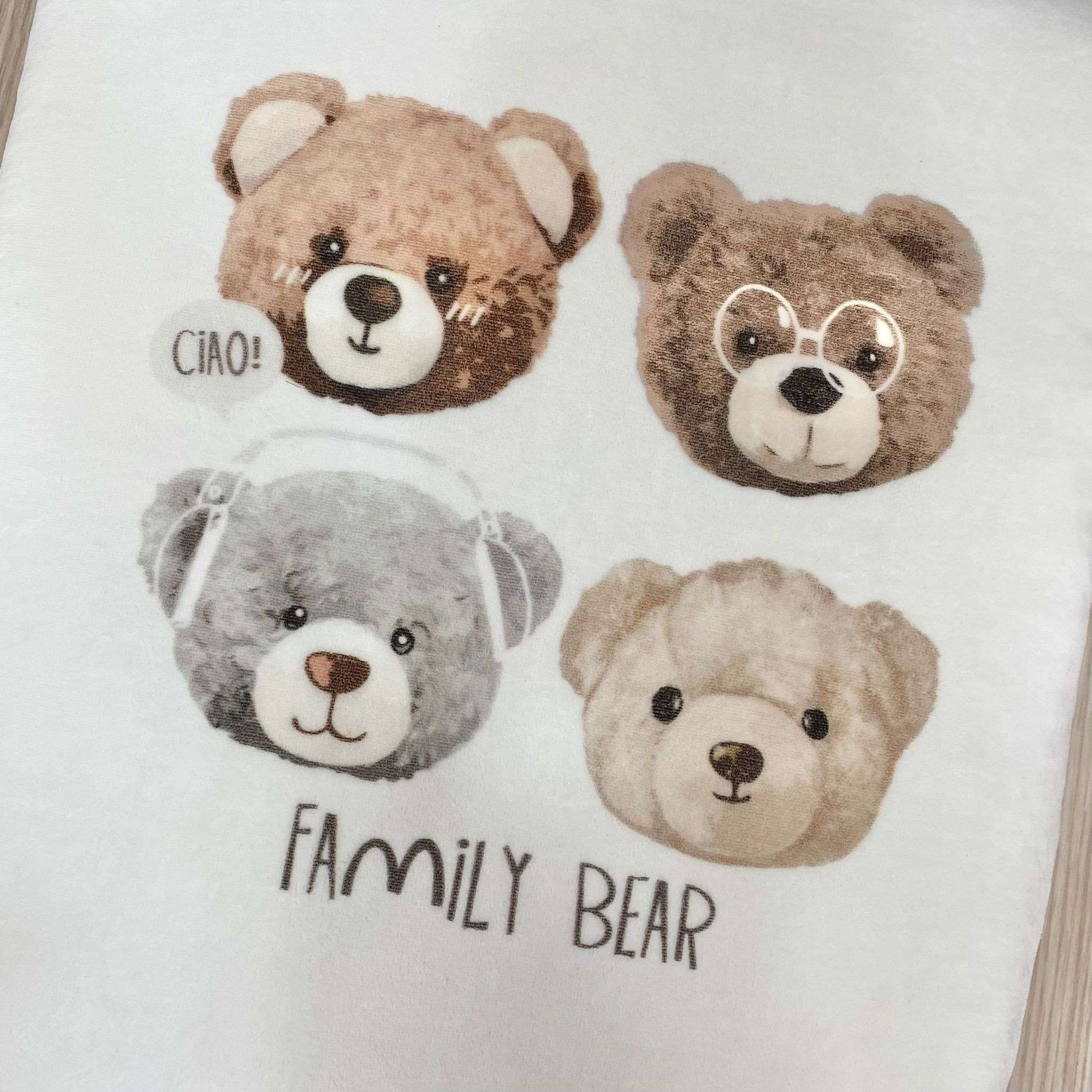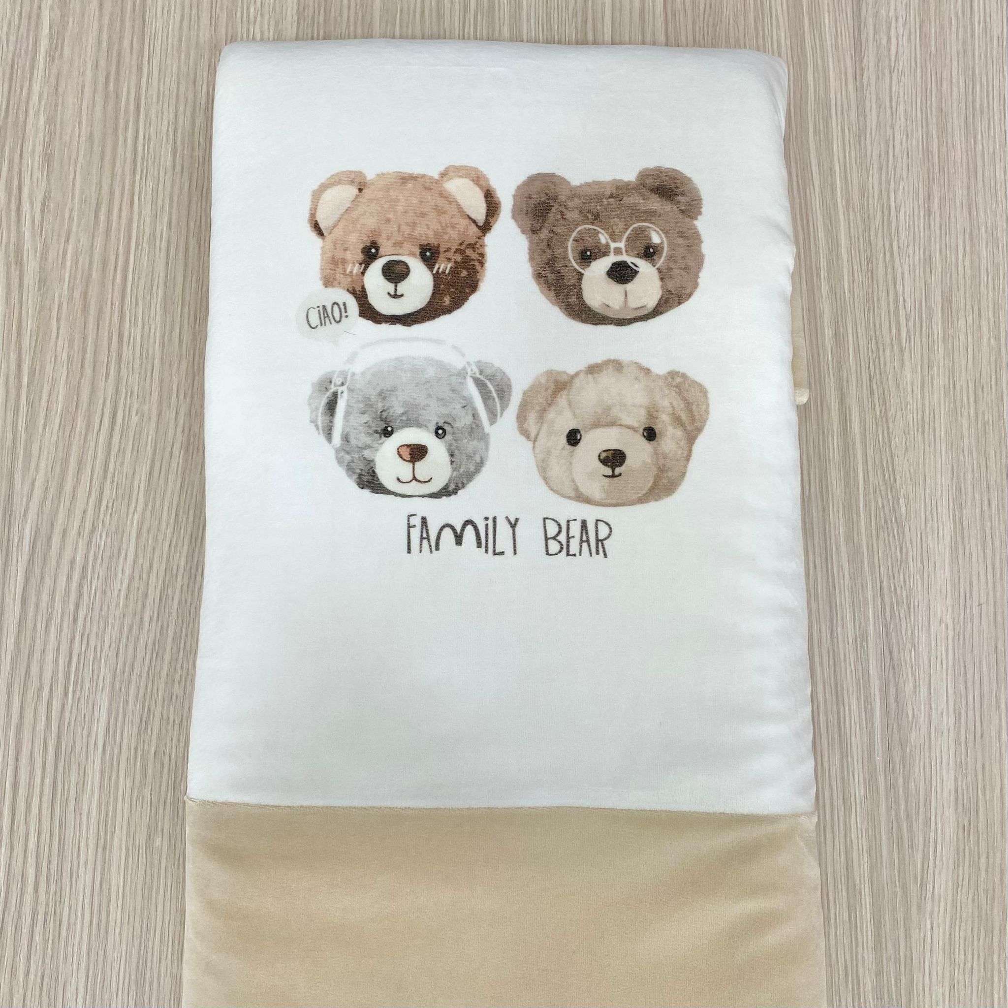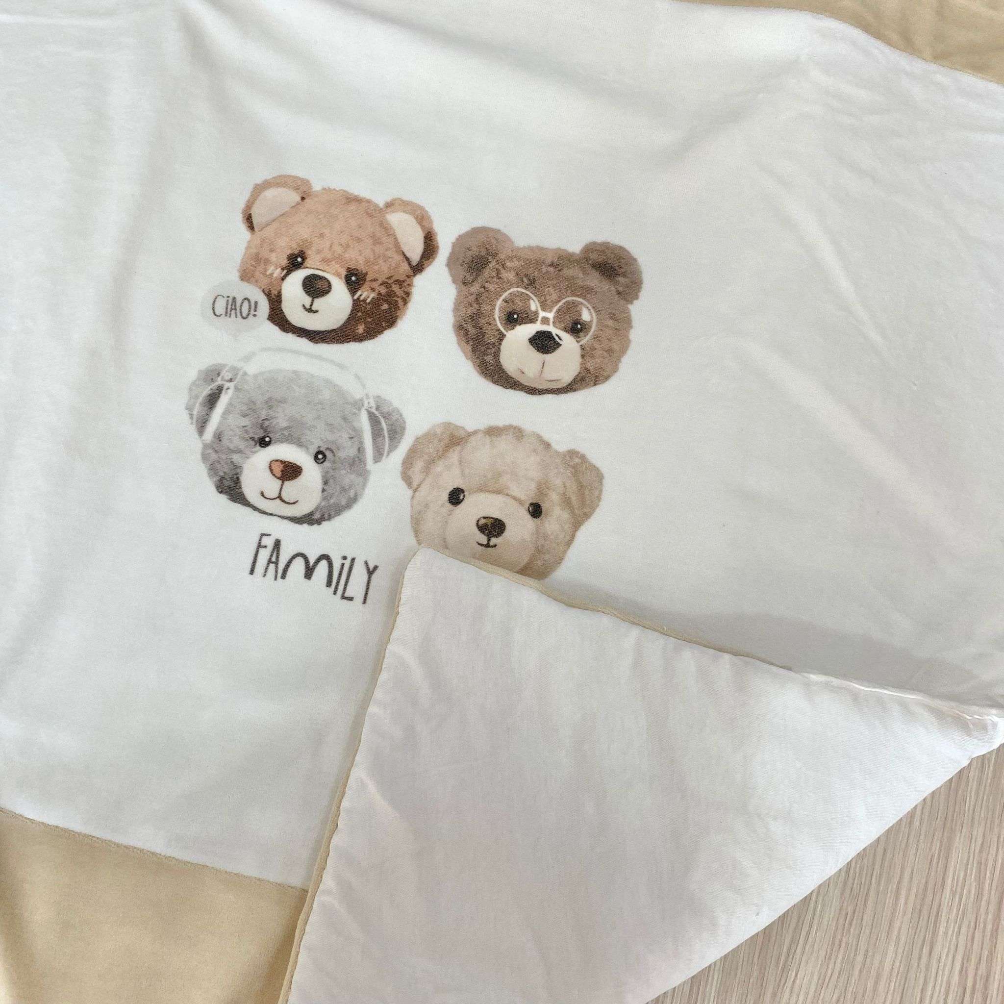 Copertina culla/carrozzina neonato in ciniglia, di colore panna e tortora con dettagli e disegni di vari colori.