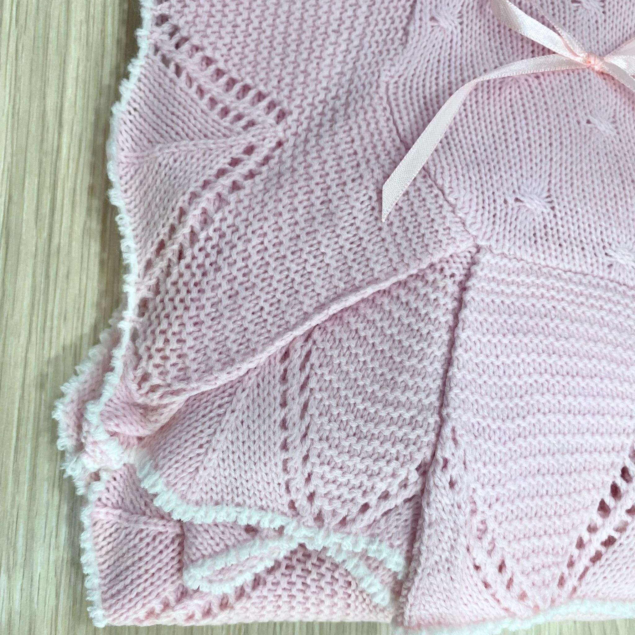 Copertina culla/carrozzina in lana smacchinata, di colore rosa, con bordino di colore bianco.