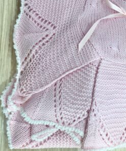 Copertina culla/carrozzina in lana smacchinata, di colore rosa, con bordino di colore bianco.