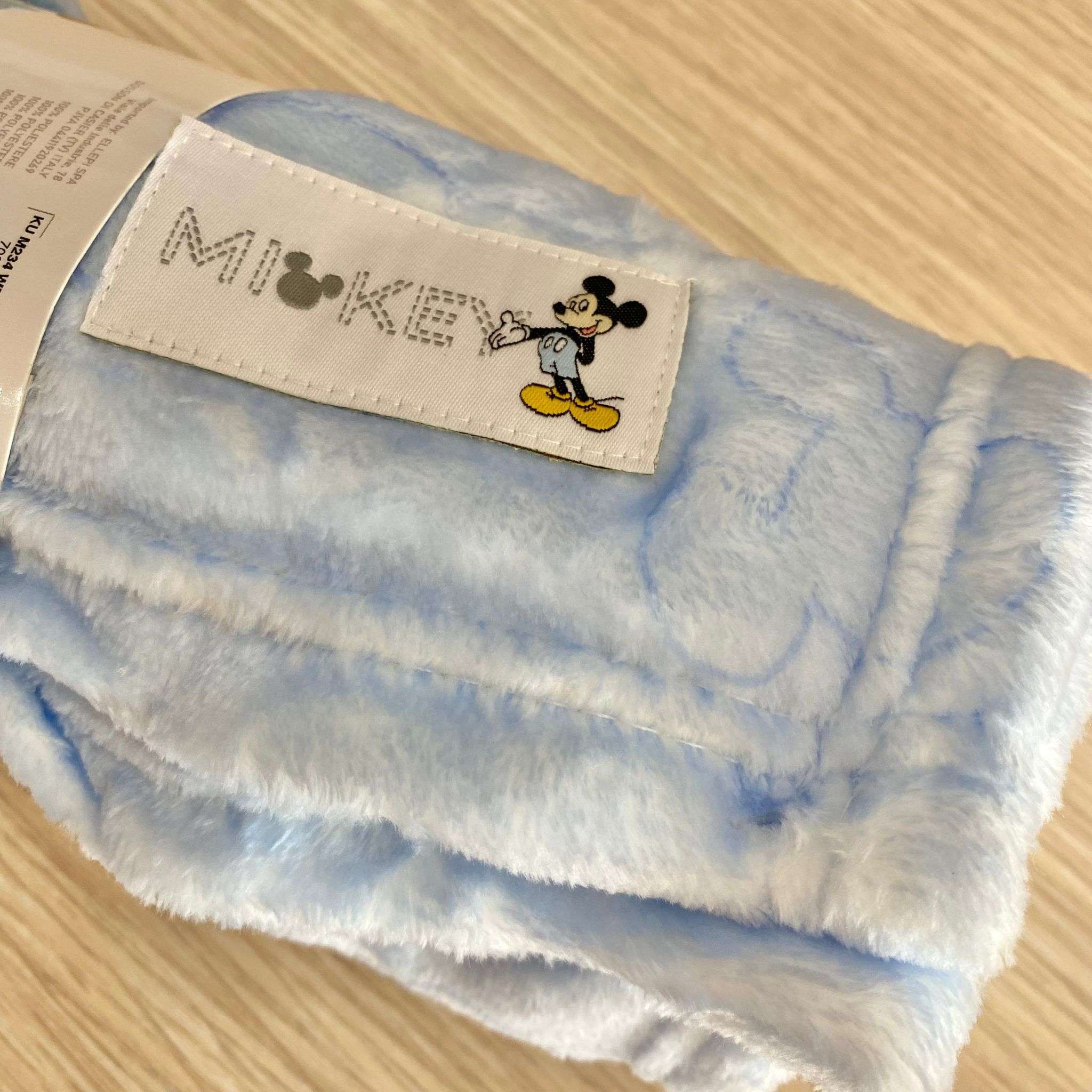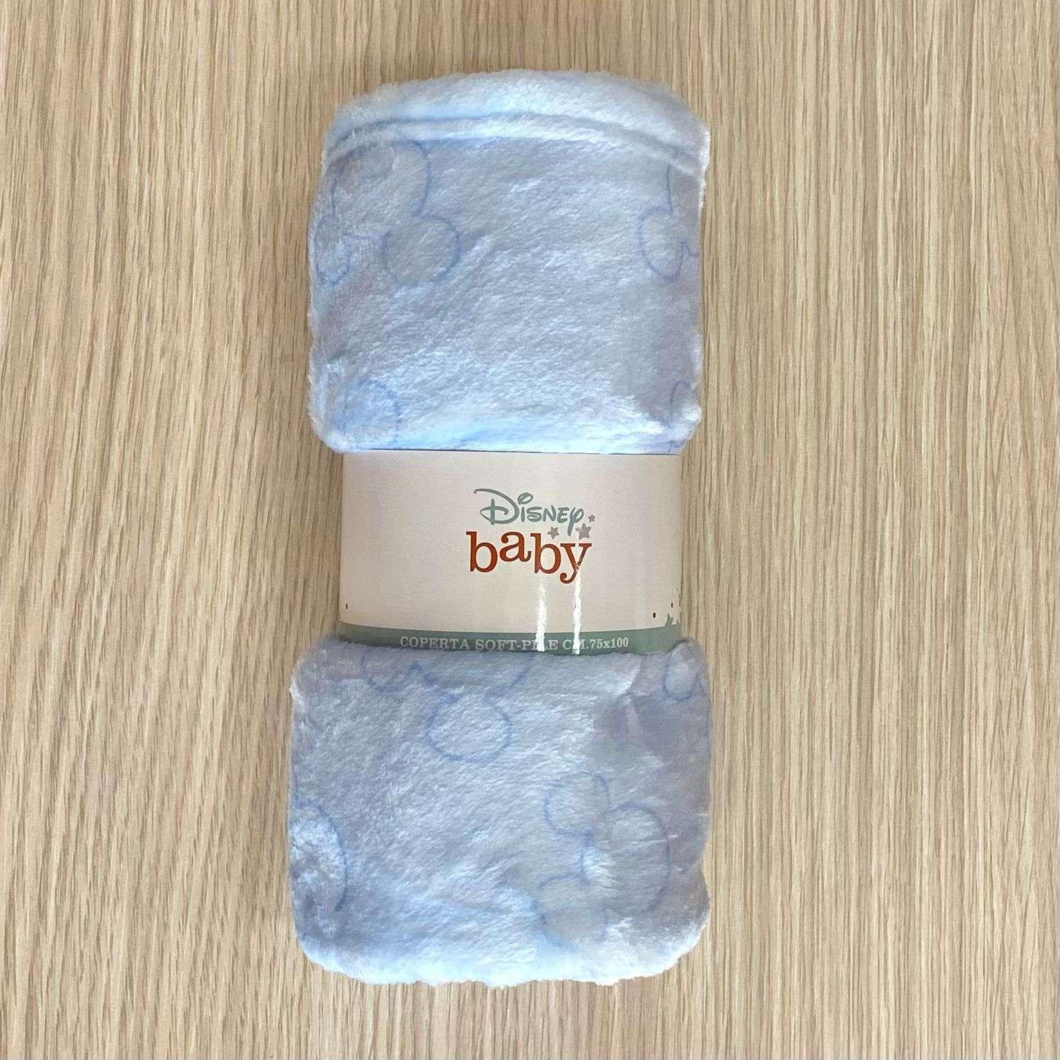 Copertina/scialletto culla/carrozzina in pile, di colore azzurro, con disegno logo Mickey Mouse.